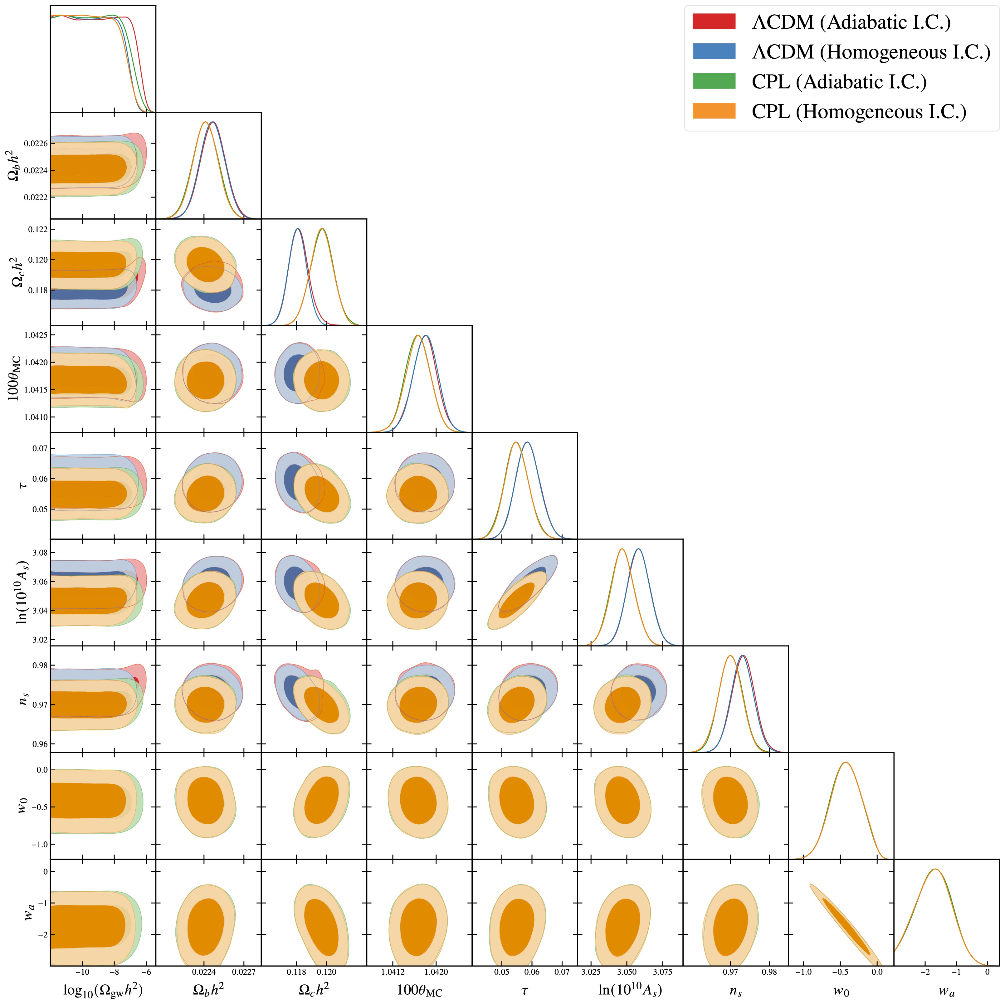 $ \Omega_{\rm gw}h^{2} $ in the interval of$ 0<\Omega_{\rm gw}h^{2}<4\times10^{-6} $ , while in Table 3 and Fig. 3 for a log-uniform prior for$ \Omega_{\rm gw}h^{2} $ in the interval of$ 10^{-12}<\Omega_{\rm gw}h^{2}<4\times10^{-6} $ . In this work, the abbreviation I.C. denotes initial conditions for gravitational waves. Parameter uncertainties are quoted at the 68% confidence level in Tables 2 and 3, while upper limits on parameters are reported at the 95% confidence level. The one- and two-dimensional posterior distributions of these parameters are presented in Figs. 2 and 3.ΛCDM ΛCDM CPL CPL (Adiabatic I.C.) (Homogeneous I.C.) (Adiabatic I.C.) (Homogeneous I.C.) $ \Omega_{\mathrm{b}} h^2 $ $ 0.02253^{+ 0.00010}_{- 0.00011} $ $ 0.02248 \pm 0.00009 $ $ 0.02245 \pm 0.00010 $ $ 0.02242 \pm 0.00010 $ $ \Omega_{\mathrm{c}} h^2 $ $ 0.11930^{+ 0.00085}_{- 0.00120} $ $ 0.11827 \pm 0.00063 $ $ 0.12028^{+ 0.00080}_{- 0.00100} $ $ 0.11986 \pm 0.00076 $ $ 100 \theta_{ \rm{ \rm{MC}}} $ $ 1.04165 \pm 0.00025 $ $ 1.04166^{+ 0.00028}_{- 0.00024} $ $ 1.04159 \pm 0.00023 $ $ 1.04156 \pm 0.00025 $ τ $ 0.0581 \pm 0.0040 $ $ 0.0586 \pm 0.0040 $ $ 0.0552 \pm 0.0041 $ $ 0.0549 \pm 0.0039 $ $ \ln (10^{10} A_{\mathrm{s}}) $ $ 3.0599 \pm 0.0077 $ $ 3.0610 \pm 0.0081 $ $ 3.0490 \pm 0.0086 $ $ 3.0491 \pm 0.0085 $ $ n_{\mathrm{s}} $ $ 0.9760 \pm 0.0035 $ $ 0.9733 \pm 0.0029 $ $ 0.9718^{+ 0.0032}_{- 0.0039} $ $ 0.9702 \pm 0.0031 $ $ w_0 $ $ -1 $ (fixed)$ -1 $ (fixed)$ - 0.44 \pm 0.20 $ $ - 0.43 \pm 0.20 $ $ w_a $ $ 0 $ (fixed)$ 0 $ (fixed)$ - 1.67 \pm 0.57 $ $ - 1.71 \pm 0.57 $ $ 10^6 \Omega_{\mathrm{gw}} h^2 $ $< 1.04 $ $< 0.27 $ $< 0.72 $ $< 0.24 $