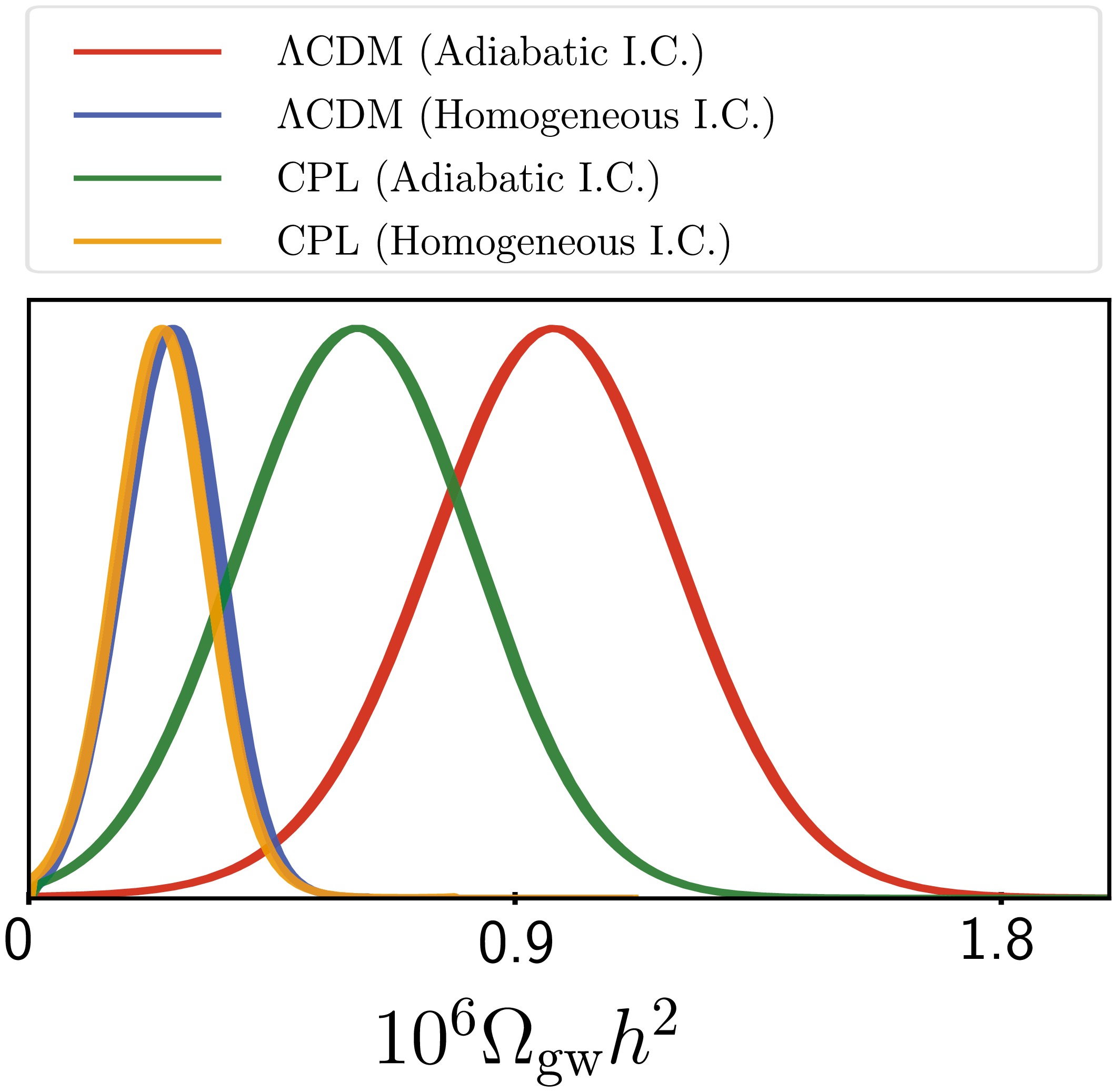 $\mathrm{CLASS}$ [28] code. Specifically, within$\mathrm{CLASS}$ , we have replicated and adapted the code modules pertaining to massless neutrinos, adopting the initial conditions listed in Table 1 of Ref. [13] to enable the code for studying gravitational waves. We exclusively consider adiabatic and homogeneous initial conditions for gravitational waves, since isocurvature initial conditions are already tightly constrained by Planck [29].Having accounted for adiabatic and homogeneous initial conditions, we investigate the physical energy-density fraction of gravitational waves in both the standard cosmological model, i.e., the ΛCDM model, and its extension incorporating the Chevallier-Polarski-Linder (CPL) parametrization [30, 31] of the equation of state of dark energy. For the former case, we consider seven independent parameters: