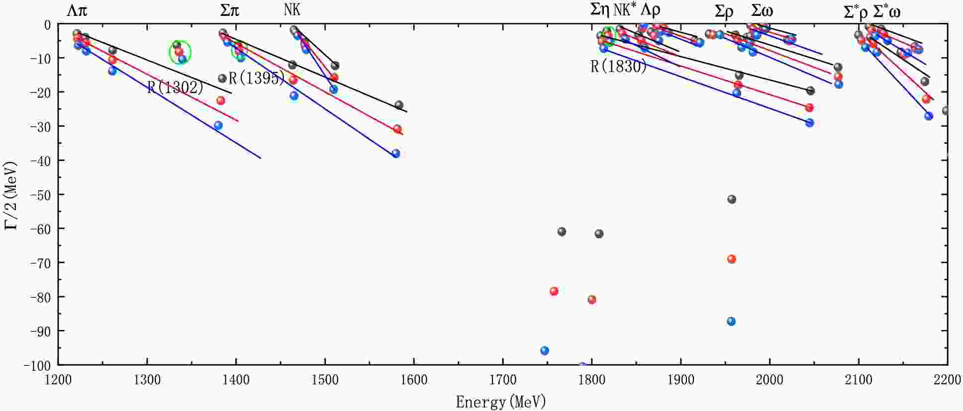 $ \Sigma \rho $ ,$ \Sigma^{*} \omega $ , and$ \Sigma^{*} \rho $ decay into scattering states. The decay widths are shown in Fig. 5 and listed in Table 5. The results of the unstable resonances coupling with decay channels and transitioning into scattering states are shown in Fig. 6. The resonance states obtained from both parameter sets are consistent in our calculations, and therefore, the decay widths are only provided for the first parameter set. According to our calculations, in Fig. 5, the decay width of$ R(1302) $ to$ \Lambda \pi $ is 5.0 MeV, and because this is the only decay channel, the total width is 5.0 MeV. For$ R(1395) $ , the decay widths to$ \Lambda \pi $ and$ \Sigma \pi $ are 24.0 and 8.6 MeV, respectively, yielding a total width of 32.6 MeV. For$ R(1830) $ , the decay widths to$ \Lambda \pi $ ,$ \Sigma \pi $ ,$ N\bar{K} $ , and$ \Sigma \eta $ are 7.6, 4.2, 4.1, and 5.0 MeV, respectively, thereby resulting in a total width of 20.9 MeV. Considering that the experimental widths of$ \Sigma(1750) $ and$ \Sigma(1900) $ are both over 100 MeV from the perspective of decay widths,$ R(1830) $ may require additional three-quark components to better explain the experimental$ \Sigma(1750) $ and$ \Sigma(1900) $ states because its width in our calculation is only 20.9 MeV. Therefore, we propose that the experimental$ \Sigma(1750) $ and$ \Sigma(1900) $ are likely to be mixed states, which contains components of both the three-quark$ \Sigma(1/2^{-}) $ and five-quark$ N\bar{K}^{*} $ states. Finally, based on the percentage of their decay widths, as shown in Table 5,$ R(1302) $ and$ R(1395) $ predominantly decay into$ \Lambda \pi $ (with more than 70%), while$ R(1830) $ has a more complex decay pattern with both$ \Lambda \pi $ and$ \Sigma \eta $ playing significant roles. According to Fig. 6, the$ \Sigma \rho $ state survives only when coupled with the$ \Sigma \eta $ and$ N \bar{K}^{*} $ channels, and it rapidly decays into the$ \Lambda \pi $ ,$ \Sigma \pi $ ,$ N \bar{K} $ , and$ \Lambda \rho $ channels. In contrast, the two more controversial resonance candidates,$ \Sigma^{*} \omega $ and$ \Sigma^{*} \rho $ , do not survive in any of the coupled decay channels. The reason why$ \Sigma \rho $ ,$ \Sigma^{*} \omega $ , and$ \Sigma^{*} \rho $ fail to form genuine resonance states is that their binding energies are too small, and this leads them to transition into scattering states once coupled with most decay channels.