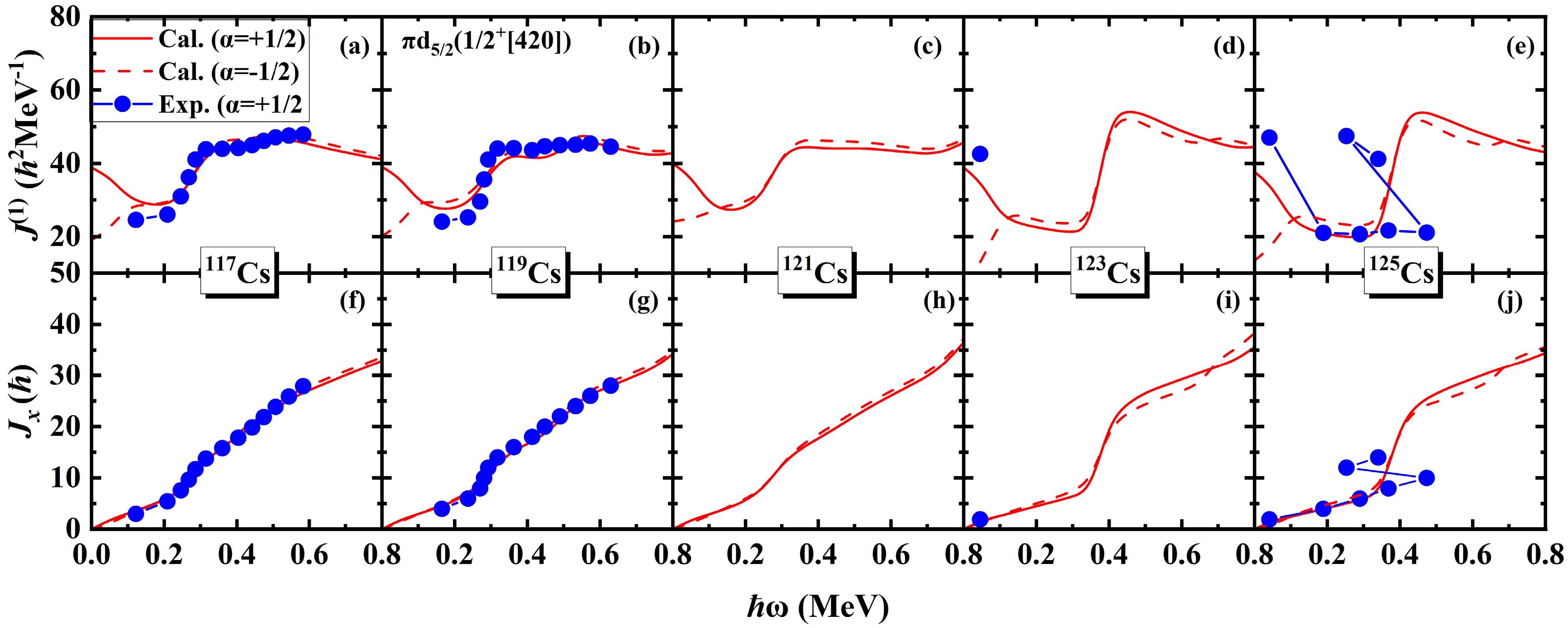 $ J^{(1)} $ (upper panels) and alignments$ J_{x} $ (lower panels) of the$ \pi d_{5/2} (1/2^+[420]) $ band in odd-even 117−125Cs. The experimental MOIs and alignments are denoted by solid dots (α=+1/2). The calculated MOIs and alignments are denoted by solid lines (α=+1/2) and dashed lines (α=-1/2). The experimental data are taken from Refs. [7, 9, 10, 12].In PNC method, the total particle number