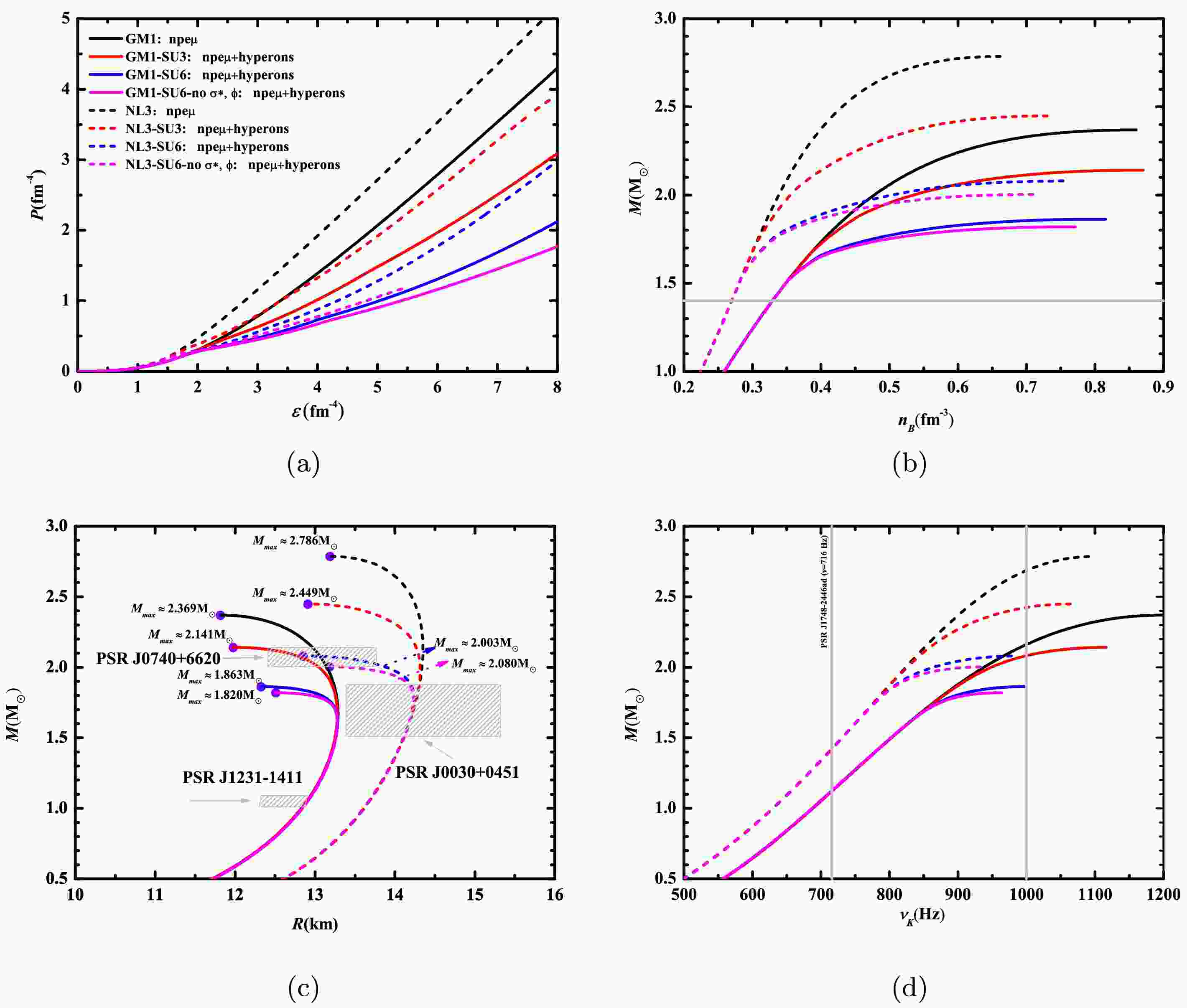 $ 1.04^{+0.05}_{-0.03} $ $ M_{\odot} $ with radius$ 12.6\pm0.3 $ km), J0030+0451 ($ 1.70^{+0.18}_{-0.19} $ $ M_{\odot} $ with radius$ 14.44^{+0.88}_{-1.05} $ km), and J0740+6620 ($ 2.073^{+0.069}_{-0.069} $ $ M_{\odot} $ with radius$ 12.49^{+1.28}_{-0.08} $ km), respectively. Based on Figure 1c and Table 2, the inferred mass and radius values of PSR J1231-1411 align with the mass-radius relations of the GM1 parameter set, indicating that it is likely to be a low-mass conventional neutron star within this theoretical framework. If the factor of hyperons is not taken into account, PSRs J0030+0451 and J0740+6620 are very likely to belong to the intermediate-mass and the massive traditional neutron stars, respectively. When hyperons are present in the interior of a neutron star, the inferred mass and radius values of PSR J0030+0451 exclusively match the mass-radius relationships of the NL3 parameter set. This suggests that it may be classified as an intermediate-mass hyperon star. Its interior will only have Λ hyperons under the SU(3) flavor symmetry, while it will have either Λ hyperons or both Λ and$ \Xi^{-} $ hyperons under the SU(6) spin-flavor symmetry. As for PSR J0740+6620, its inferred mass and radius values are consistent with the mass-radius relations of case (ii) under the GM1 parameter set and case (iii) under the NL3 parameter set. This strongly indicates that this pulsar is likely a massive hyperon star, with its interior containing Λ,$ \Xi^{-} $ , or Λ,$ \Xi^{-} $ , and$ \Xi^{0} $ hyperons. Figure 1d presents the mass-frequency relationships for the GM1 and NL3 parameter sets under both symmetry assumptions, incorporating the observational constraints from the currently known fastest-spinning pulsar: PSR J1748-2446ad with a spin frequency of ν = 716 Hz [56]. Under our model and parameter settings, PSR J1748-2446ad is likely a conventional neutron star with a relatively small mass. As shown in Figure 1d, when the Keplerian frequency exceeds 1000 Hz, the possible mass range of neutron stars varies significantly. According to the calculation results of the GM1 and NL3 parameter sets, the mass range of sub-millisecond pulsars with$ f= $ 1000 Hz is approximately between 1.86$ M_{\odot} $ and 2.70$ M_{\odot} $ , falling within the category of medium to high mass.