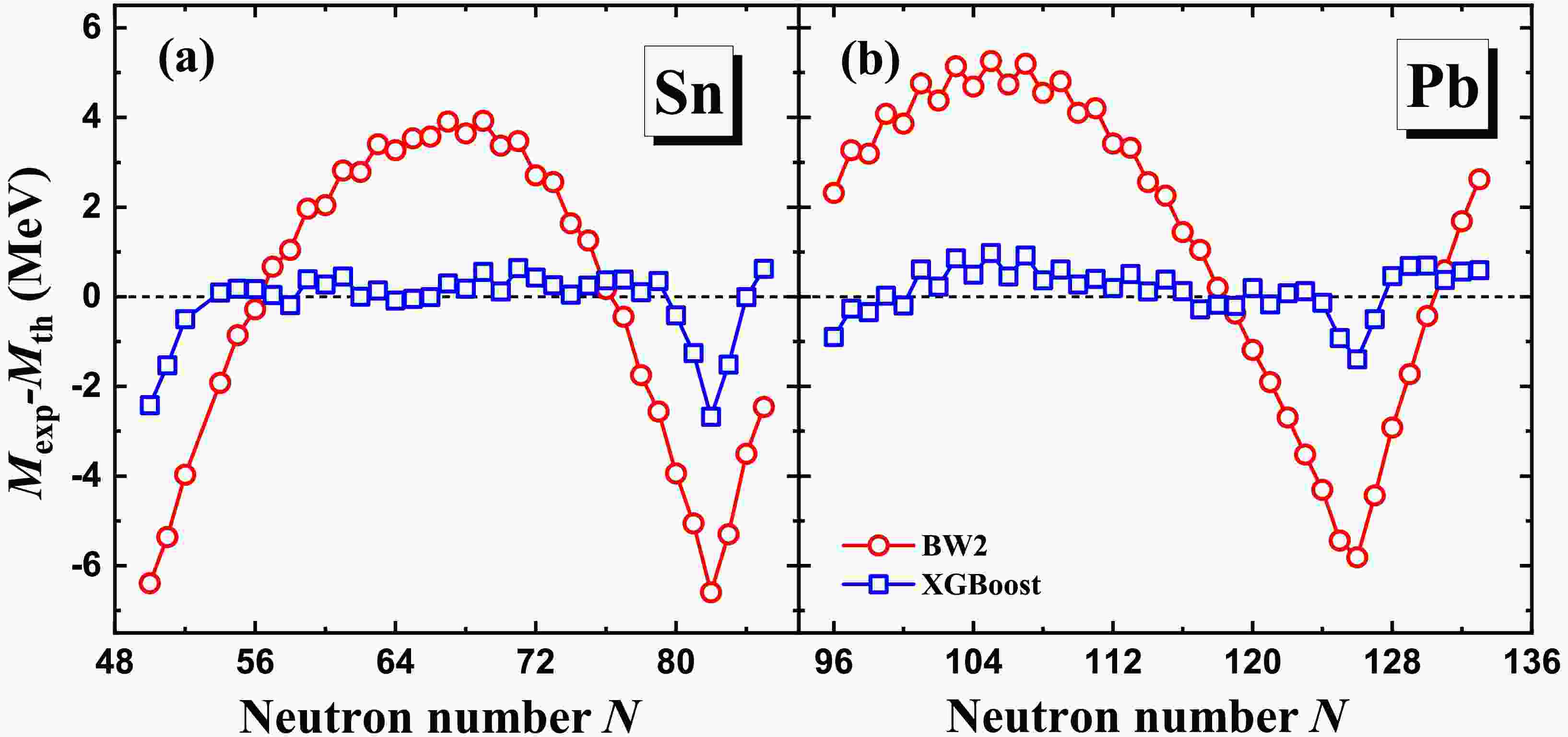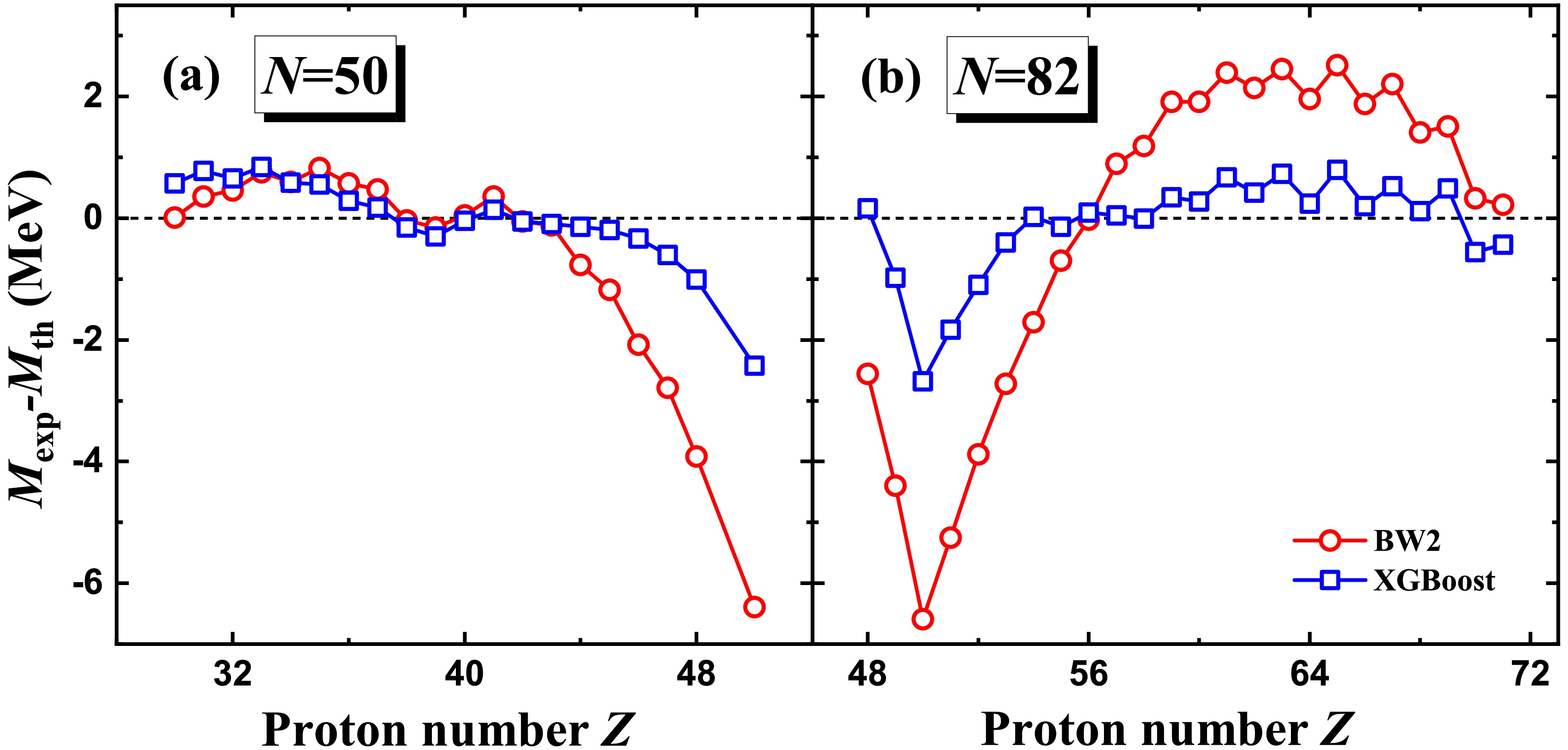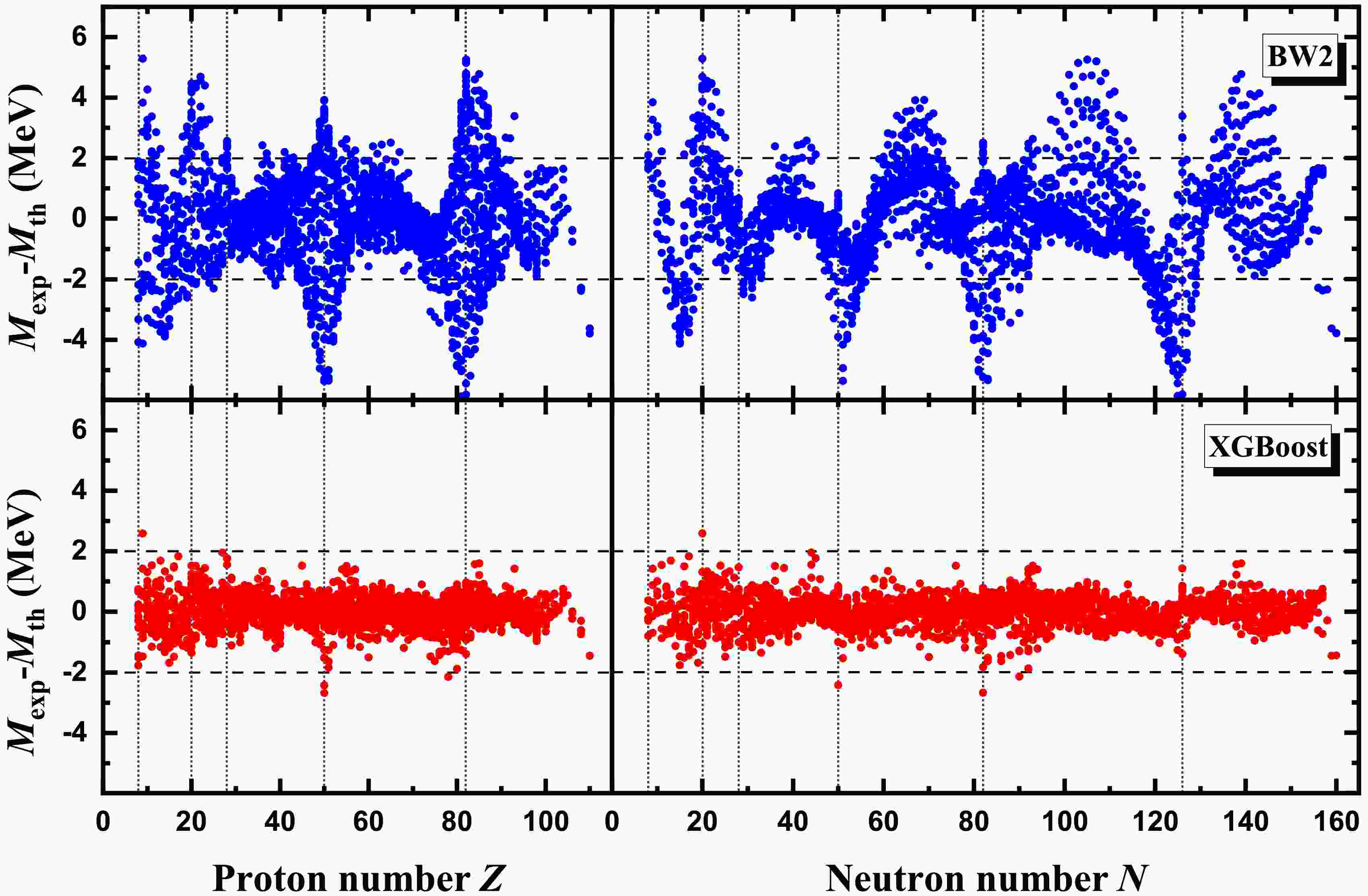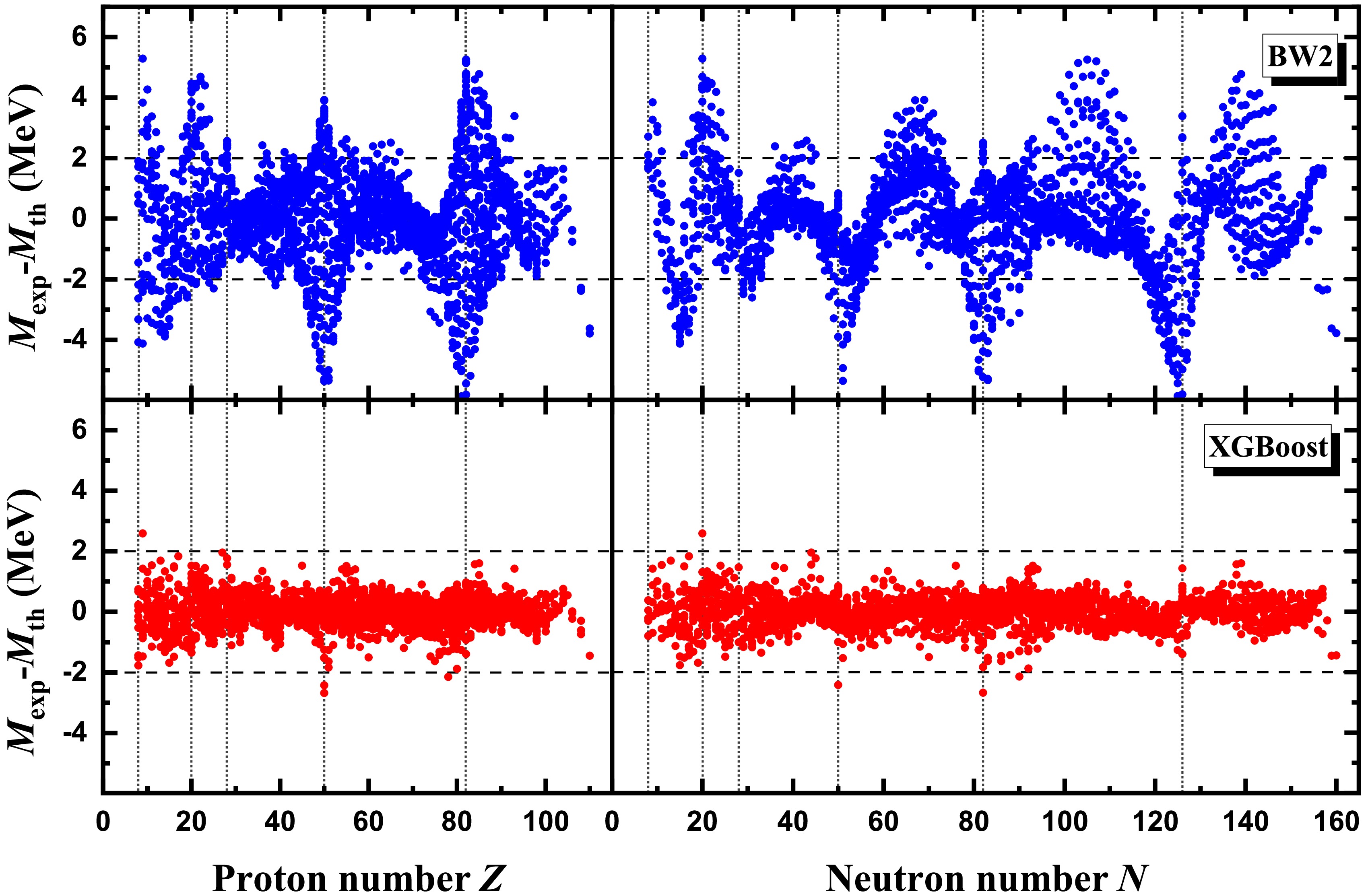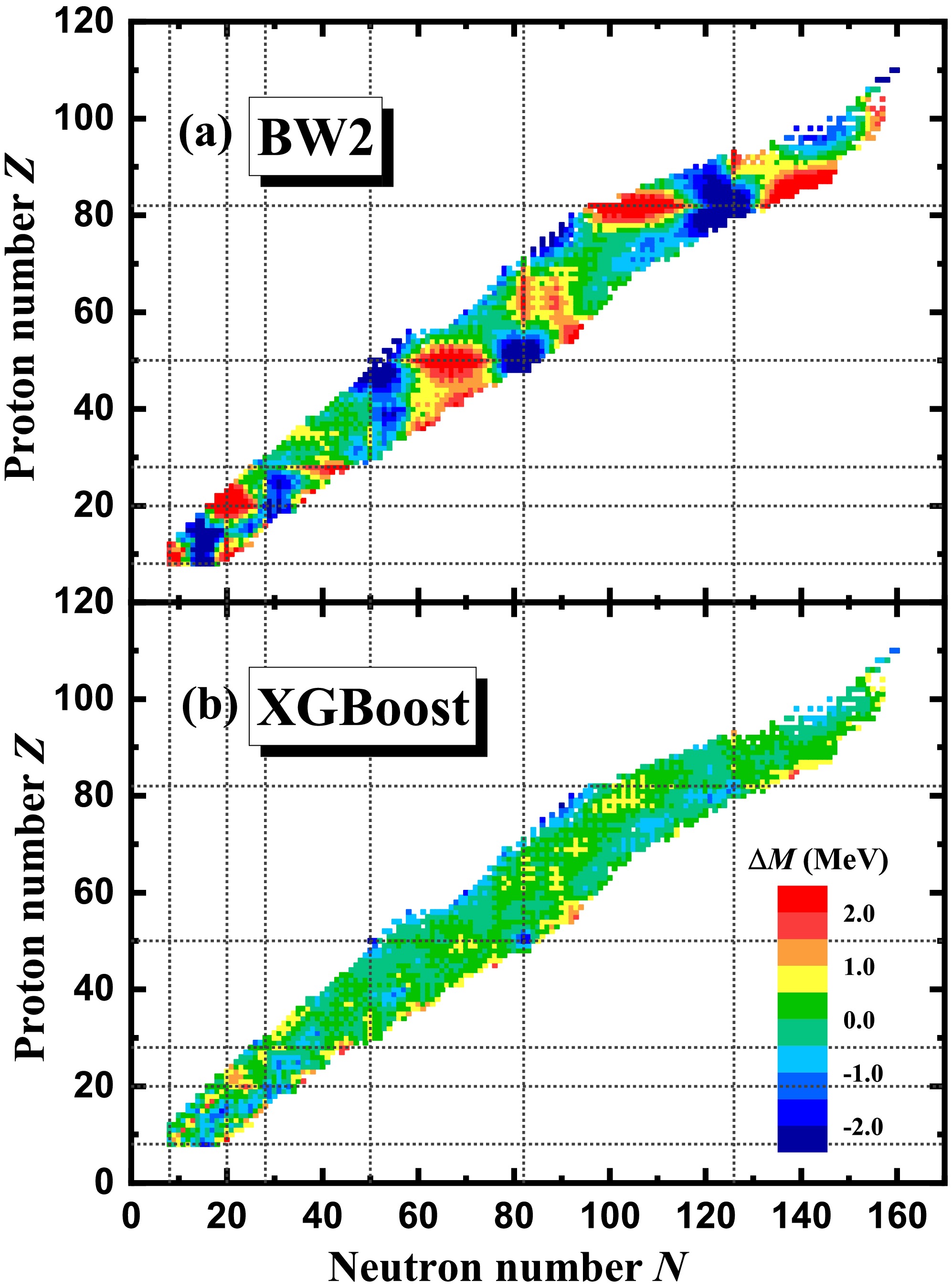 Figure 1. (color online) Mass differences between the experimental data in AME2020 [12] and theoretical predictions. Panels (a) and (b) correspond to the BW2 and XGBoost mass models, respectively.