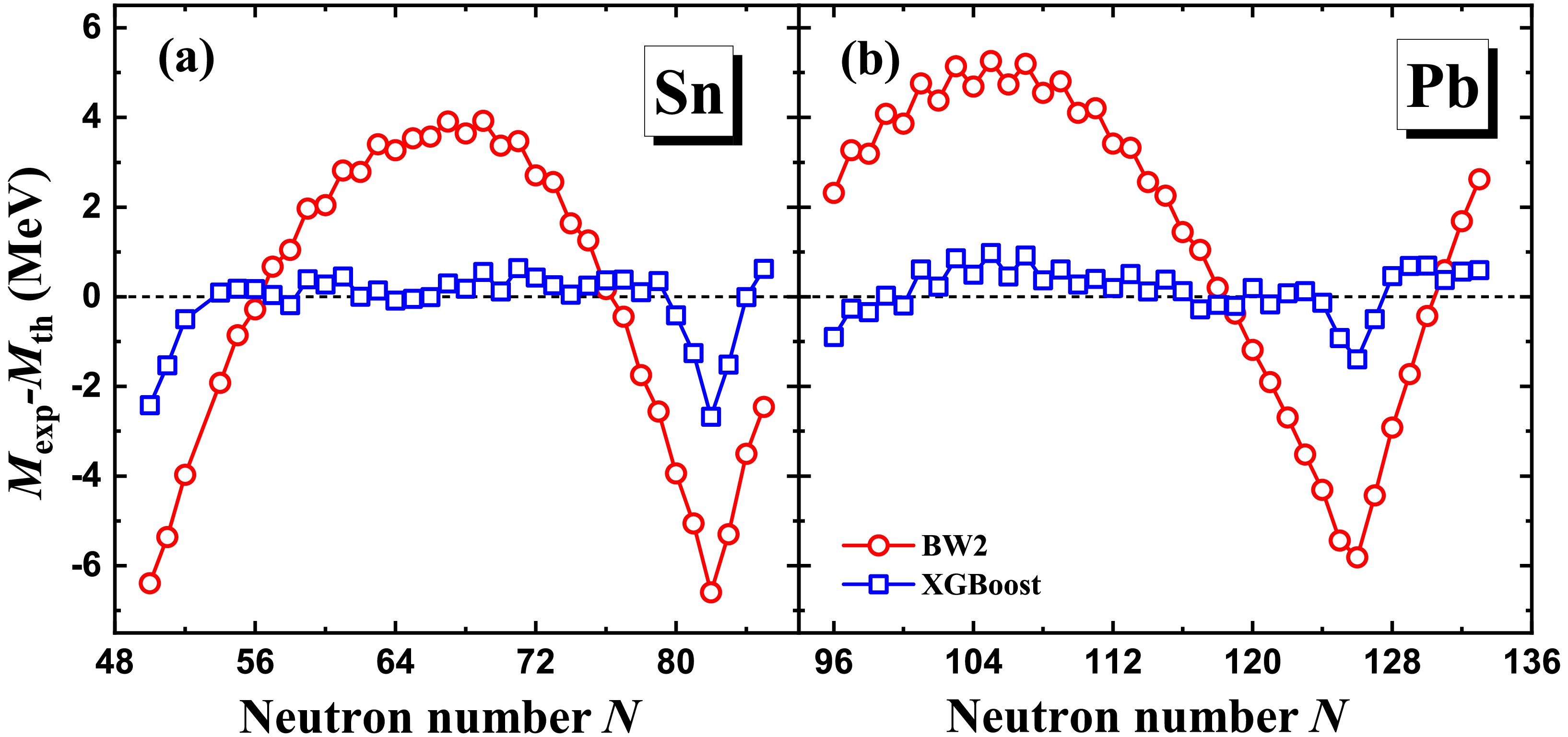 Figure 3. (color online) Differences between the experimental mass [12] and XGBoost results for Sn (a) and Pb (b) isotopes.