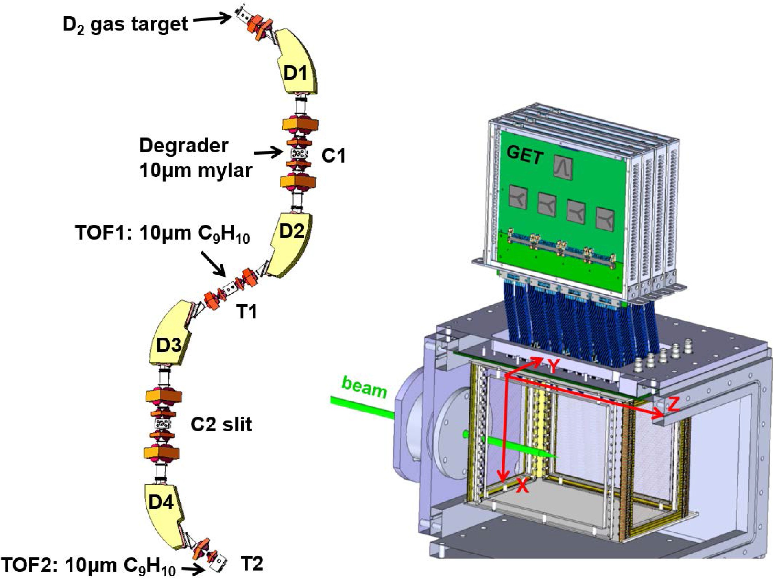 The beam was subsequently transported from T1 to T2 using the second stage of RIBLL1. Two 10-μm plastic scintillators placed in the T1 and T2 chambers provided Time-of-Flight (TOF) information, and a 300-μm silicon detector downstream of the T2 scintillator measured the total kinetic energy. To suppress contamination from
