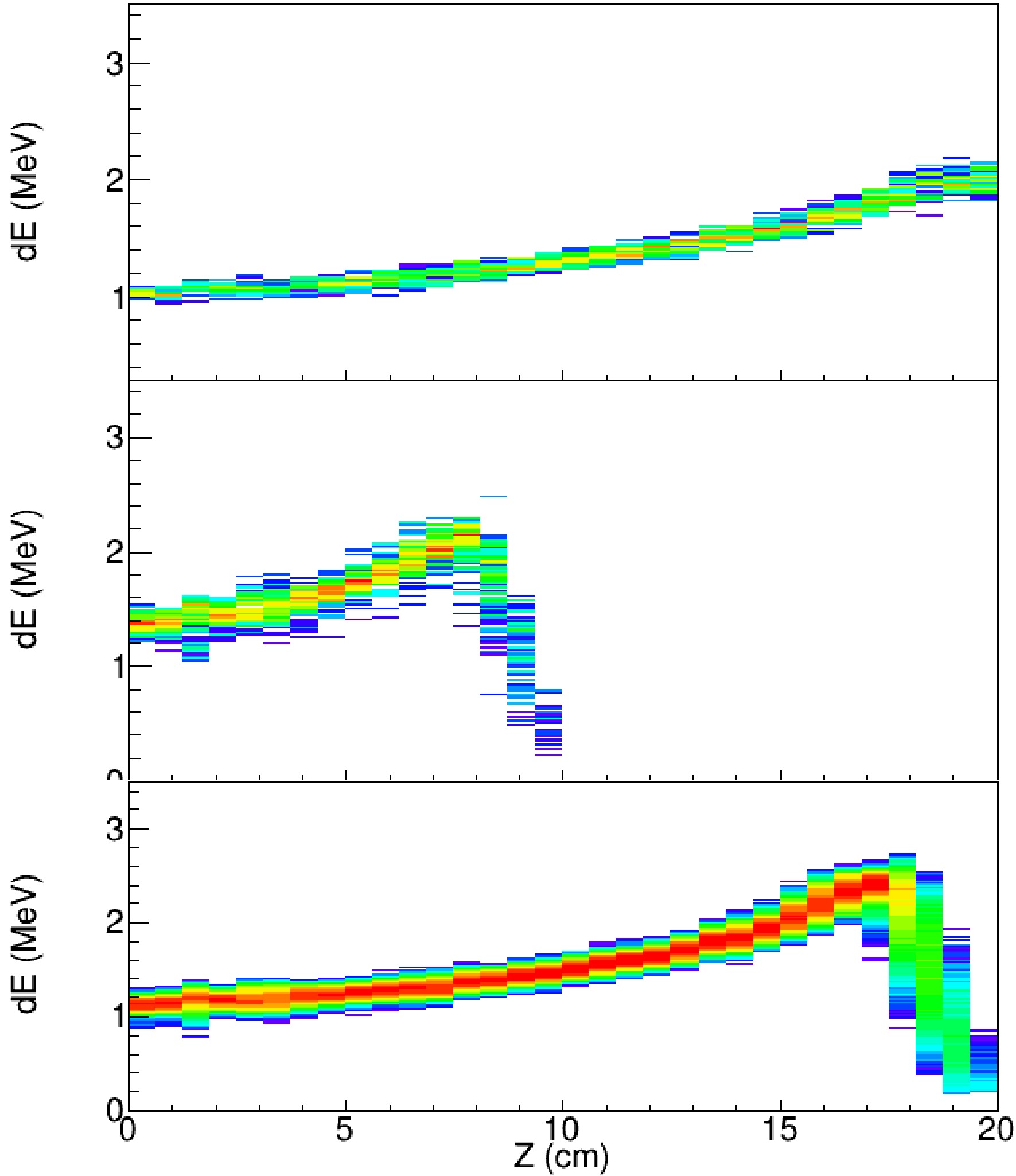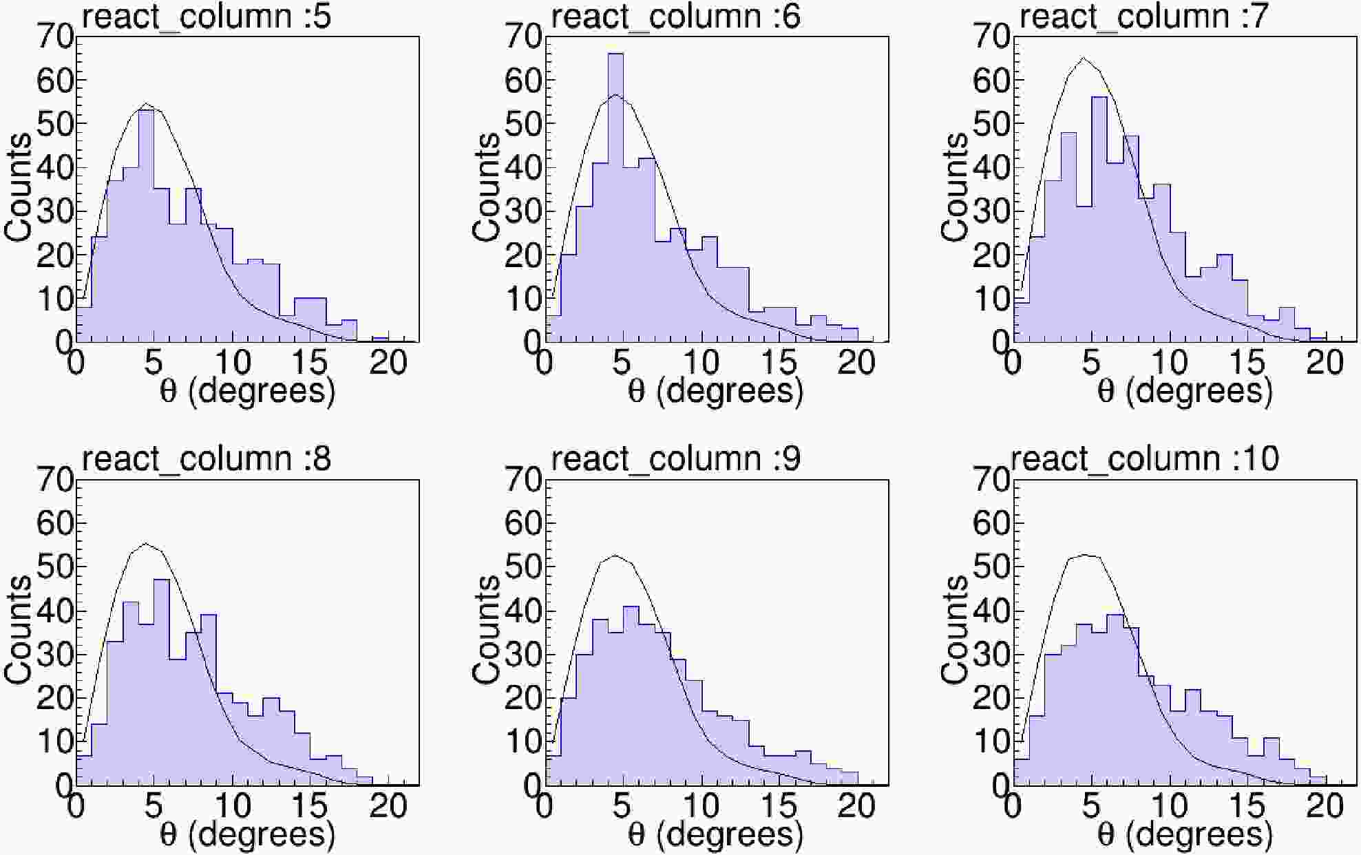 $dE(i)$ represents the energy loss in the$i-{\rm{th}}$ column. The recorded events were classified into two categories, reacted events and un-reacted events, based on the condition$dE(i) > 1.3 \, dE(i-1)$ , with i ranging from 1 to 31. The location of the i-th column was then identified as the reaction position, and the i-th column was labeled as the react_column in this paper. An example of the reaction vertex determination is shown in Fig. 4. The exact 3D location of the reaction vertex was determined by the intersection of tracks of the beam particle and reaction products.