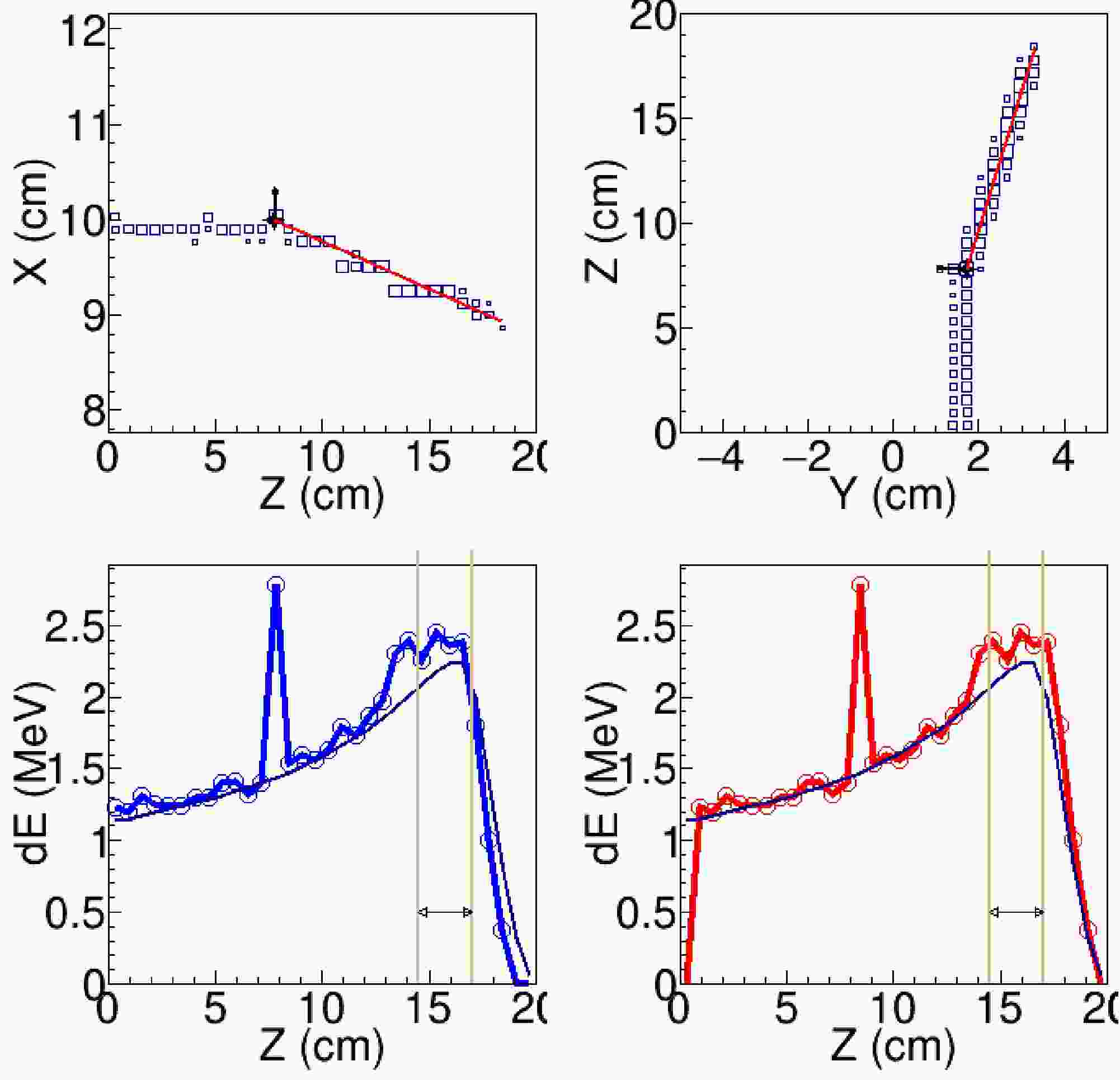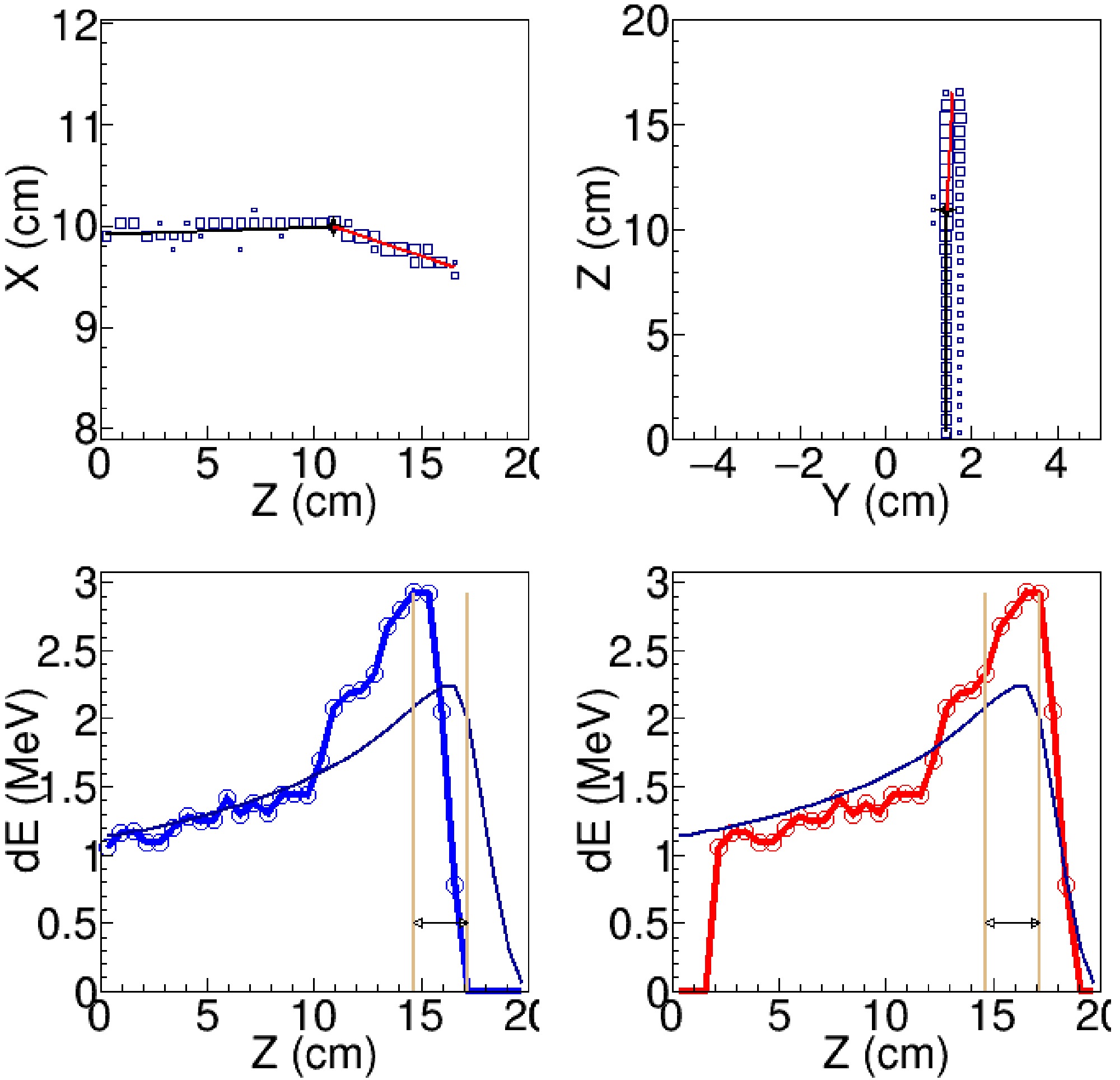 Figure 5. (color online) One-track fusion event. (Upper left) Track projection in the X–Z plane. (Upper right) Track projection in the Y–Z plane. (Lower left) Energy-loss curve along the Z-axis, with the measured energy-loss profile shown in blue and the template curve in black. (Lower right) Energy-loss curve after shifting to the position that yields the minimum