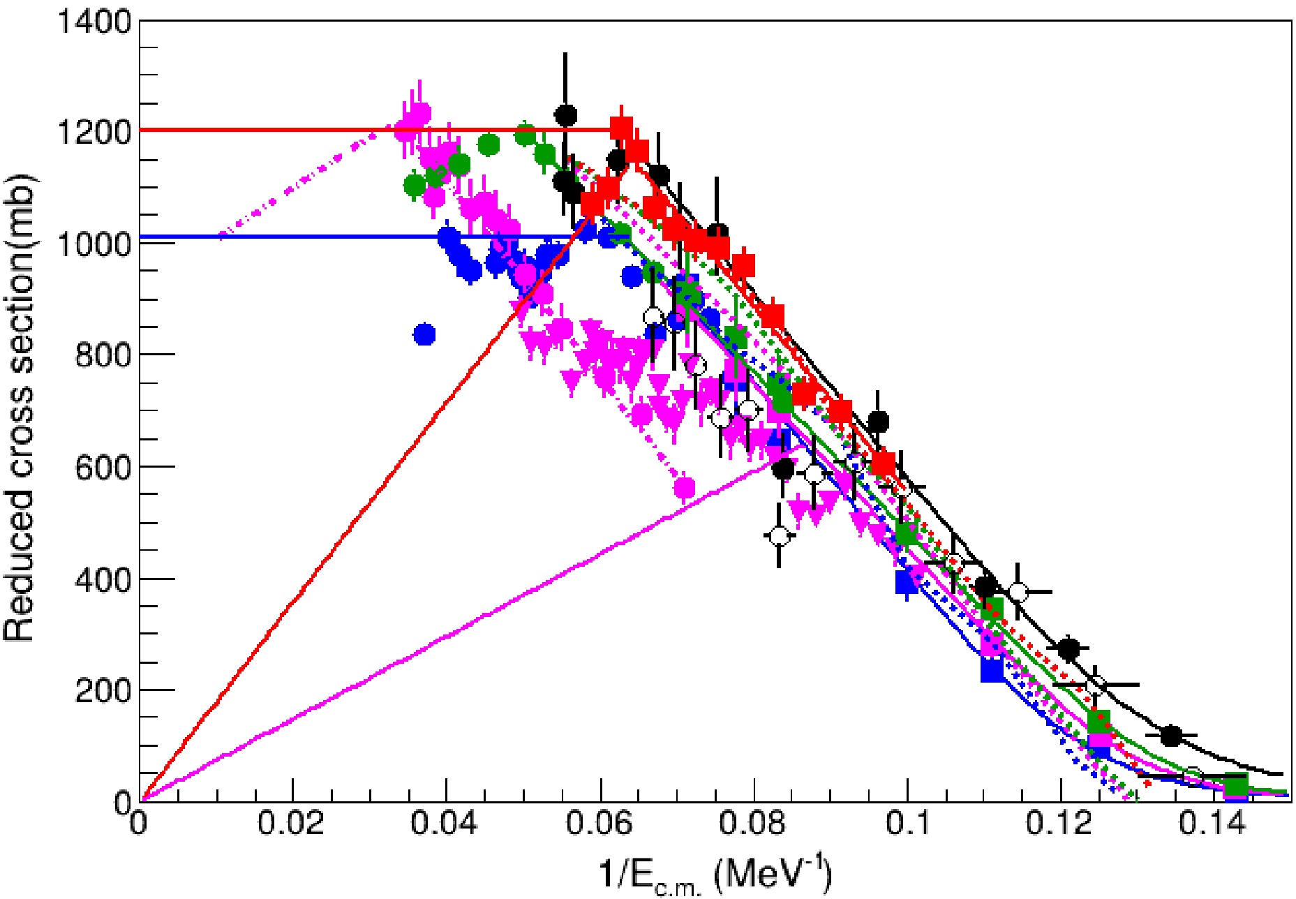 Figure 14. (color online) The reduced fusion cross section vs. the 1/