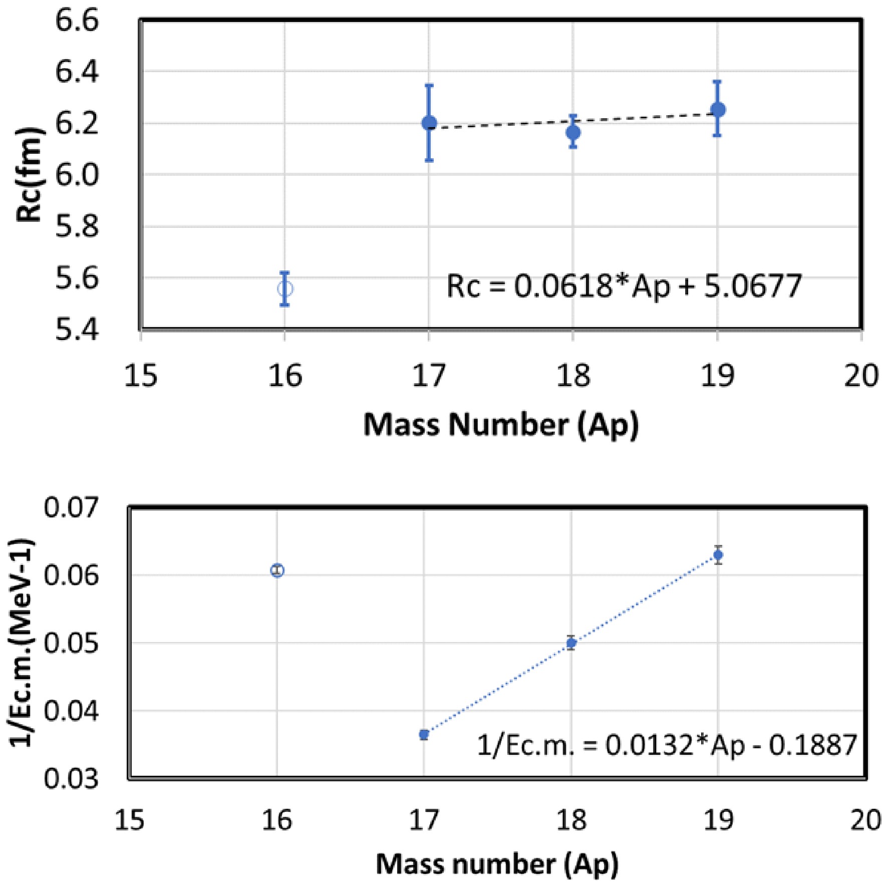 $^{16}{\rm{O}}$ and$^{17,18,19}{\rm{O}}$ , respectively. The dashed line is the best fit to the systems involving$^{17,18,19}{\rm{O}}$ . The best fit equations to the$^{17,18,19}{\rm{O}}$ are also shown in the figures.$ R_{c} = {l_{cr}{\rlap- \lambda }(E_{cr})}. $