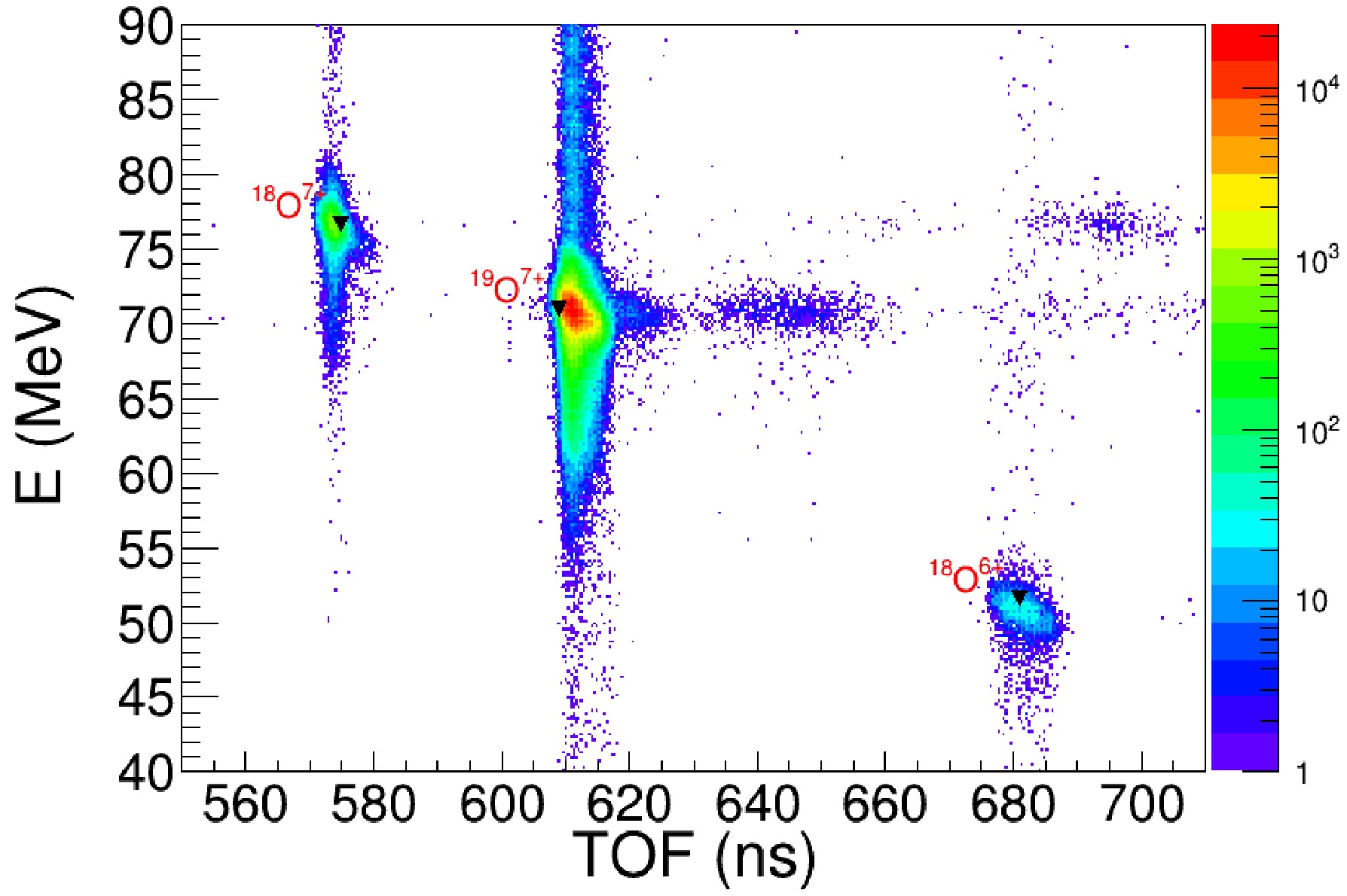 $^{19}{\rm{F}}$ , the 7+ charge state of$^{19}{\rm{O}}$ was selected.From the TOF–energy correlations obtained with the plastic detectors and the silicon detector (Fig. 2), the secondary beam intensity was determined to be