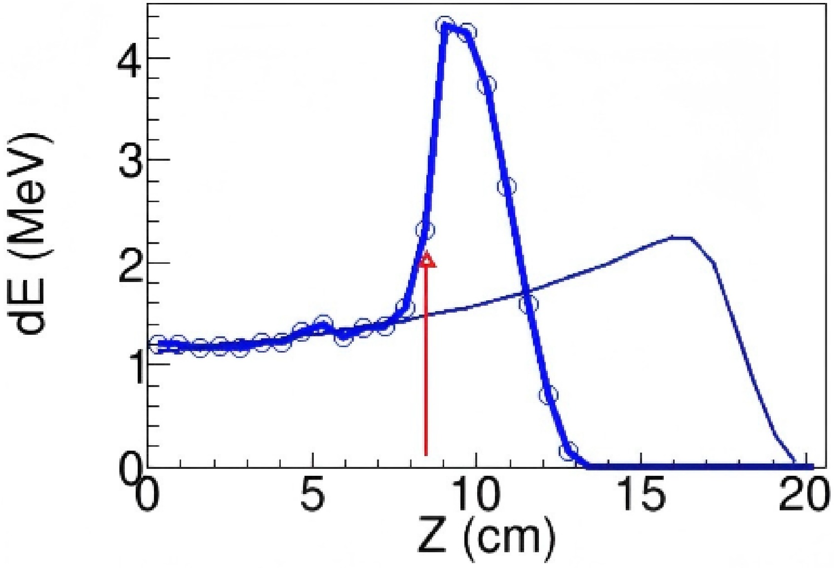 Figure 4. (color online) Determination of the reaction vertex based on the energy loss along the Z-axis. The red arrow marks the reaction-vertex position. The black line represents the pad-by-pad energy loss predicted by the SRIM calculation after tuning the gas density to match the measured beam energy and range.
