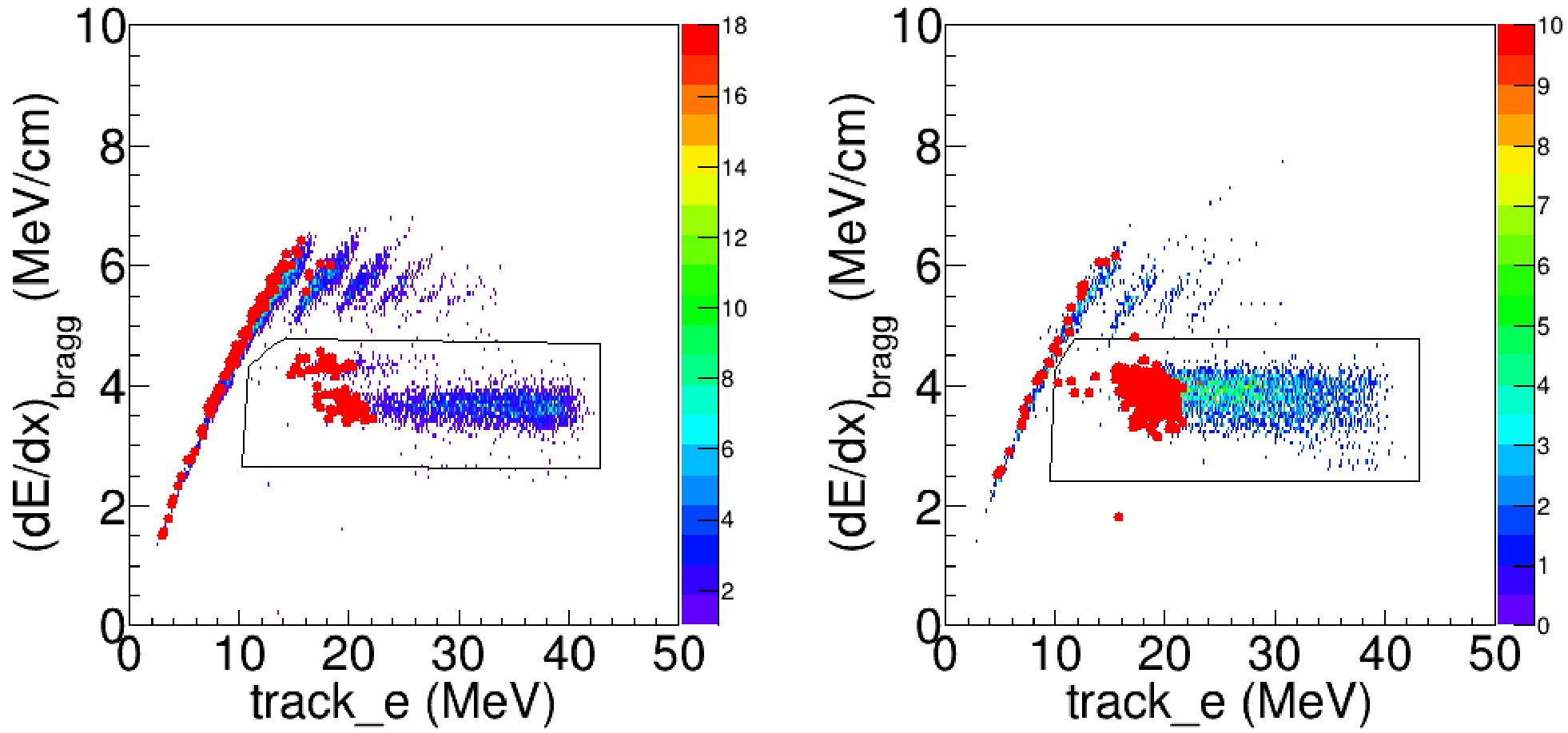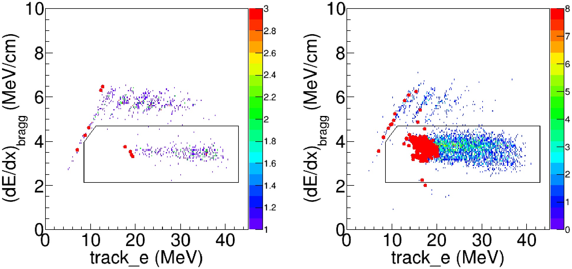 $(dE/dx)_{\mathrm{Bragg}}$ versus the summed energies of the reaction-product tracks with laboratory scattering angles less than$10^\circ$ (left panel) and between$10^\circ$ and$20^\circ$ (Right panel). The red dots indicates reaction events on the 18th pad. The black box denotes the non-fusion events. -