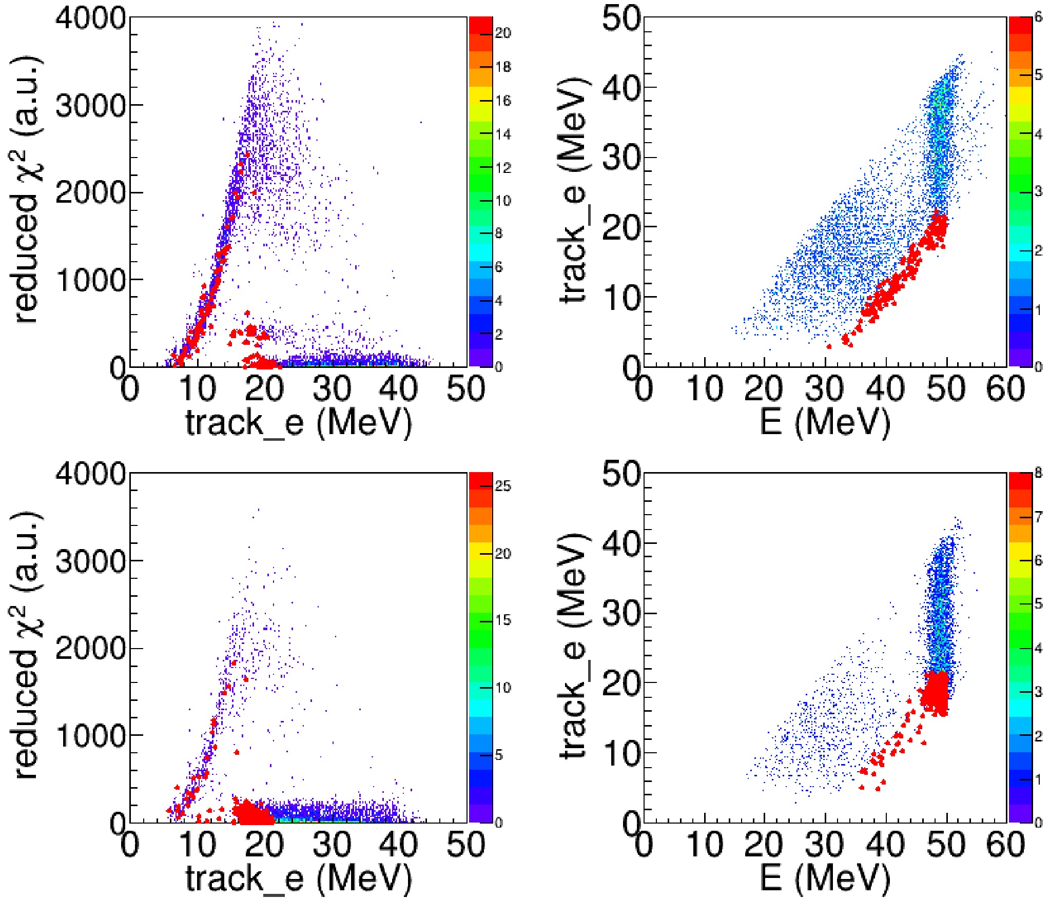 $\chi^2$ vs. the summed energy of the reaction-product track for the reacted events with scattering angles less than$10^{\circ}$ ; (Upper right panel) The summed energy of the reaction-product track vs. the total energy deposition in the TPC for the events with scattering angles less than$10^{\circ}$ . The lower left and right panels are identical to the upper left and right panels except for the reacted events with scattering angles between$10^{\circ}$ and$20^{\circ}$ . The red dots indicates the candidates for the fusion reaction, identified by the cut shown in Fig. 7 on the 18th pad.Here we take the reaction events occurring on the 18th pad as an example to illustrate our analysis of the fusion events. These events have the lowest reaction energy,