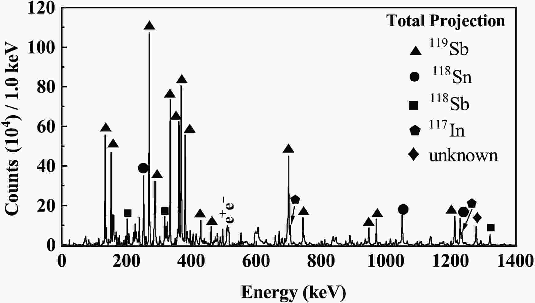 Figure 1.  Total projection spectrum of the symmetric $ \gamma-\gamma $ matrix. Triangles, circles, squares, and pentagons denote transitions from $ ^{119} {\rm{Sb}}$, $ ^{118} {\rm{Sn}}$, $ ^{118} {\rm{Sb}}$, and $ ^{117} {\rm{In}}$, respectively. The diamond represents a transition of unknown origin. The transitions of $ ^{118} {\rm{Sn}}$ are primarily from the β-decay of $ ^{118} {\rm{Sb}}$.
