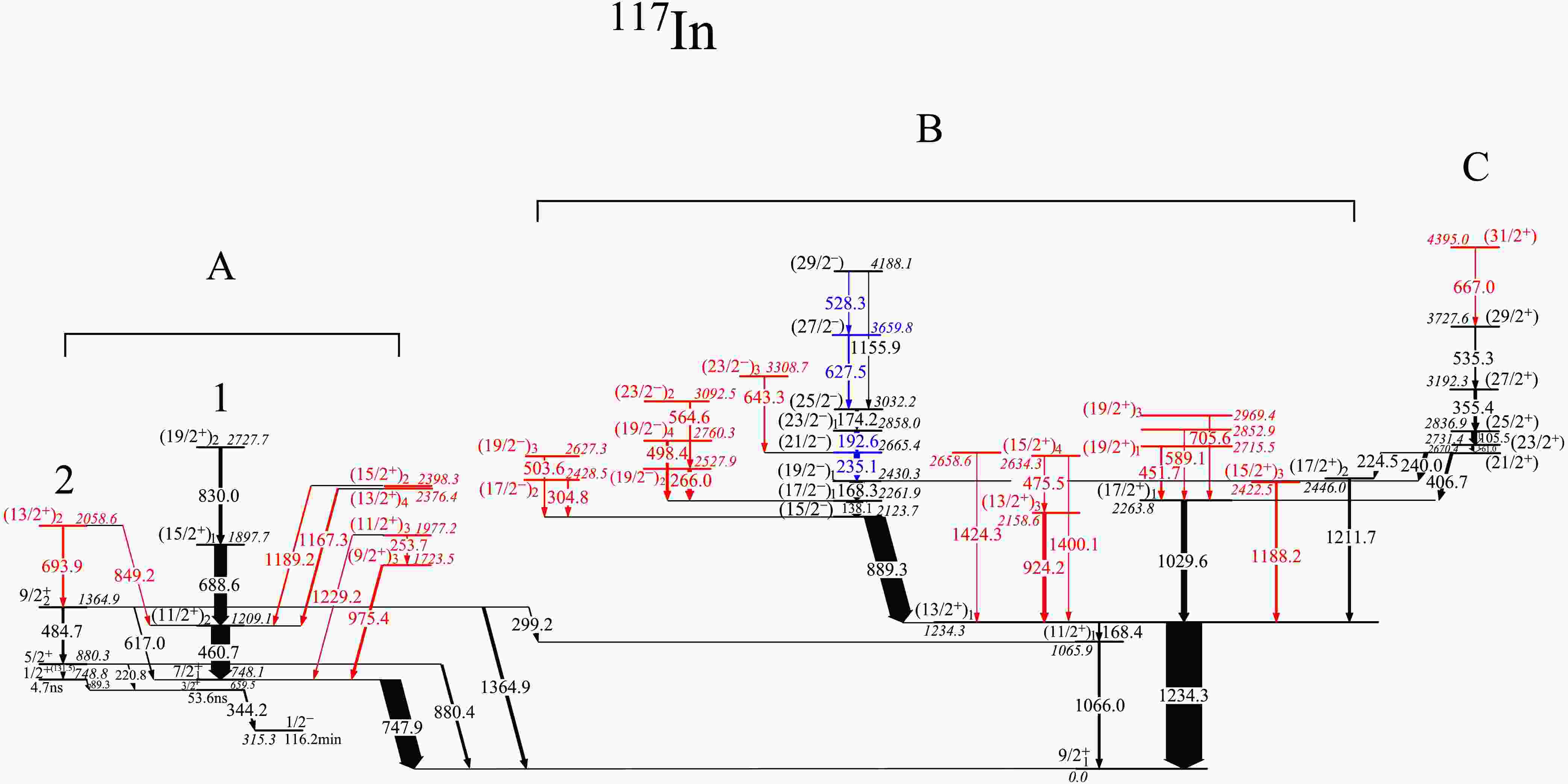 Figure 2.  (color online) Level scheme of $ ^{117} {\rm{In}}$ deduced from the present work. The transition energies are given in keV, and the widths of the arrows are proportional to the relative transition intensities. The new transitions and levels identified in this work are marked in red. The rearranged transitions and levels are marked in blue. The 131.5 keV transition (in parentheses) is taken from Ref. [38]. The half-lives of the 1/2, 3/2+, and 1/2+ levels are taken from the ENSDF [37].