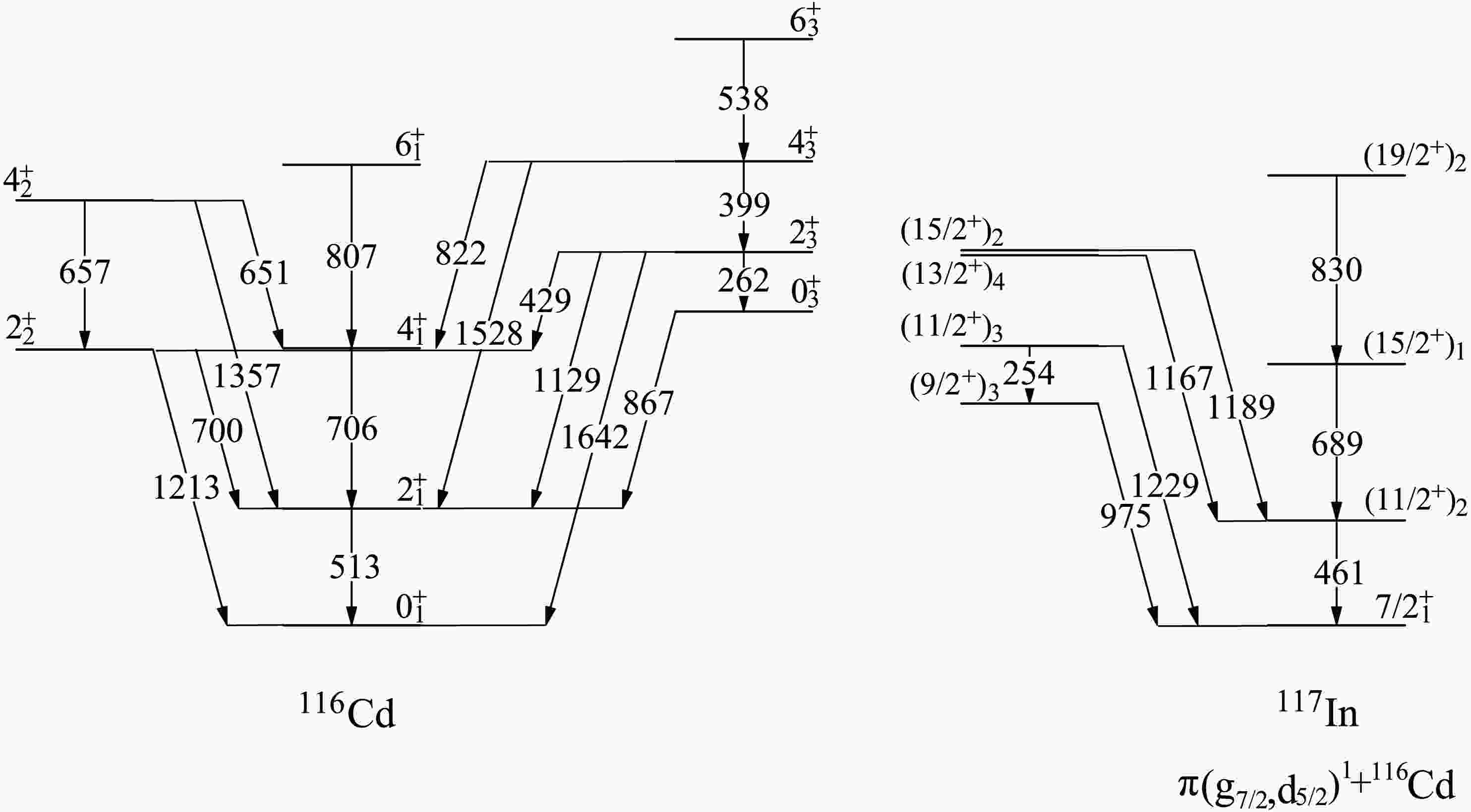 Figure 4.  Comparison of the low-lying states in $ ^{116} {\rm{Cd}}$ [43, 44] and the levels in Structure A of $ ^{117} {\rm{In}}$. The energy of the 7/21+ level of $ ^{117} {\rm{In}}$ is set as 0 for the convenience of comparison.