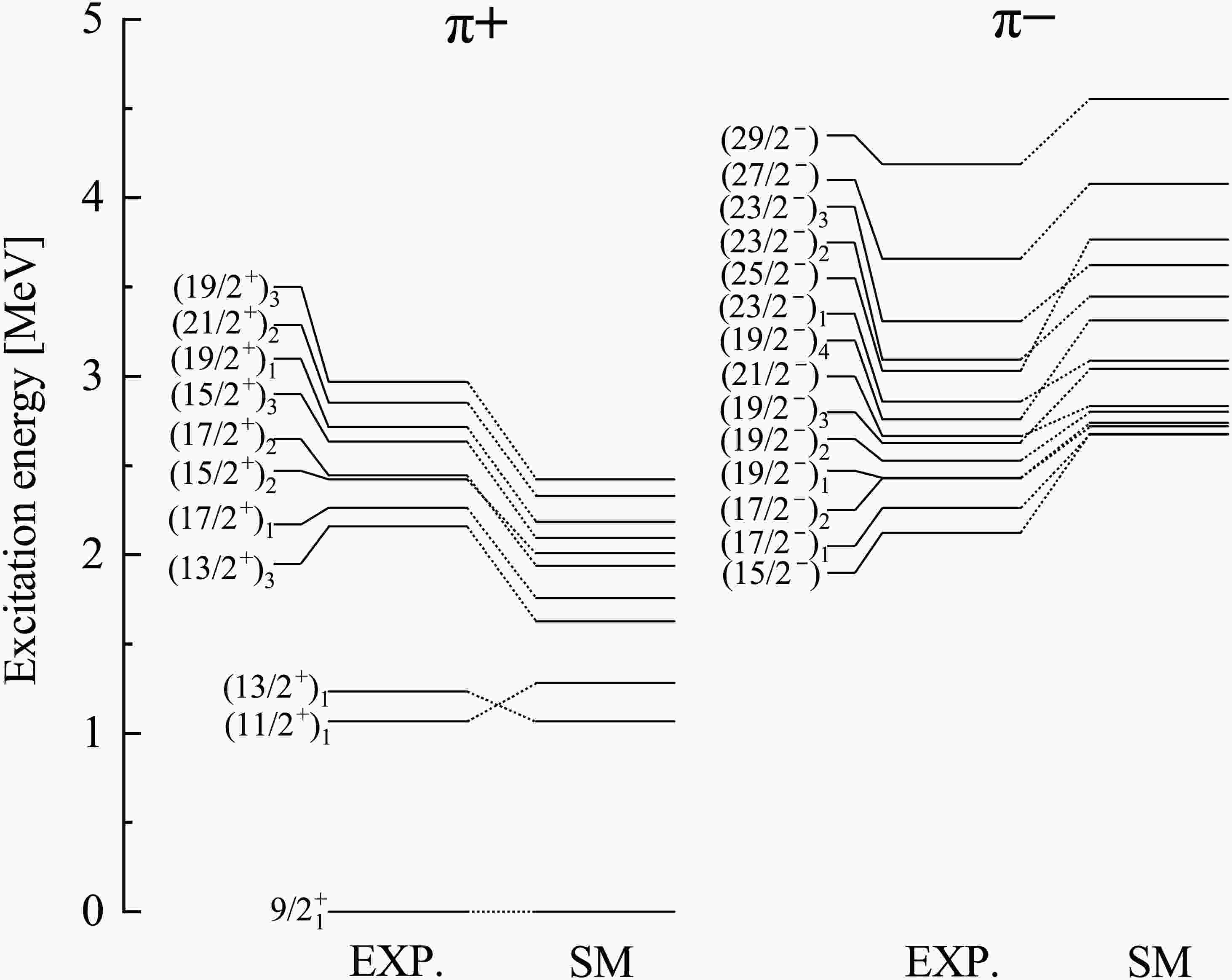 The absence of a regular band-like structure indicates that the states in structure B may originate from single-particle excitations. Thus, shell-model calculation provides a suitable approach to describe these states. In this work, the shell-model calculations were performed for $ ^{117} {\rm{In}}$ using the NUSHELLX code within the SNE model space [45]. The adopted two-body matrix elements are named SNET in the code [45]. The SNE model space includes eight proton orbitals ($ \pi 1f_{5/2} $, $ \pi 2p_{3/2} $, $ \pi 2p_{1/2} $, $ \pi 1g_{9/2} $, $ \pi 1g_{7/2} $, $ \pi 2d_{5/2} $, $ \pi 2d_{3/2} $, and $ \pi 3s_{1/2} $) and nine neutron orbitals ($ \nu 1f_{5/2} $, $ \nu 2p_{3/2} $, $ \nu 2p_{1/2} $, $ \nu 1g_{9/2} $, $ \nu 1g_{7/2} $, $ \nu 2d_{5/2} $, $ \nu 2d_{3/2} $, $ \nu 3s_{1/2} $, and $ \nu 1h_{11/2} $). To make the calculation feasible, the following truncation was used. The $ \pi 1f_{5/2} $, $ \pi 2p_{3/2} $, and $ \pi 2p_{1/2} $ orbitals and $ \nu 1f_{5/2} $, $ \nu 2p_{3/2} $, $ \nu 2p_{1/2} $, and $ \nu 1g_{9/2} $ orbitals were kept fully occupied. The $ \pi 1g_{9/2} $ orbital was occupied by nine protons. At least six neutrons were constrained on the $ \nu 1g_{7/2} $ orbital and four neutrons were constrained on the $ \nu 2d_{5/2} $ orbital. No restrictions were applied to the $ \nu 2d_{3/2} $ and $ \nu 3s_{1/2} $ orbitals. A maximum of two neutrons were permitted in the $ \nu 1h_{11/2} $ orbital.