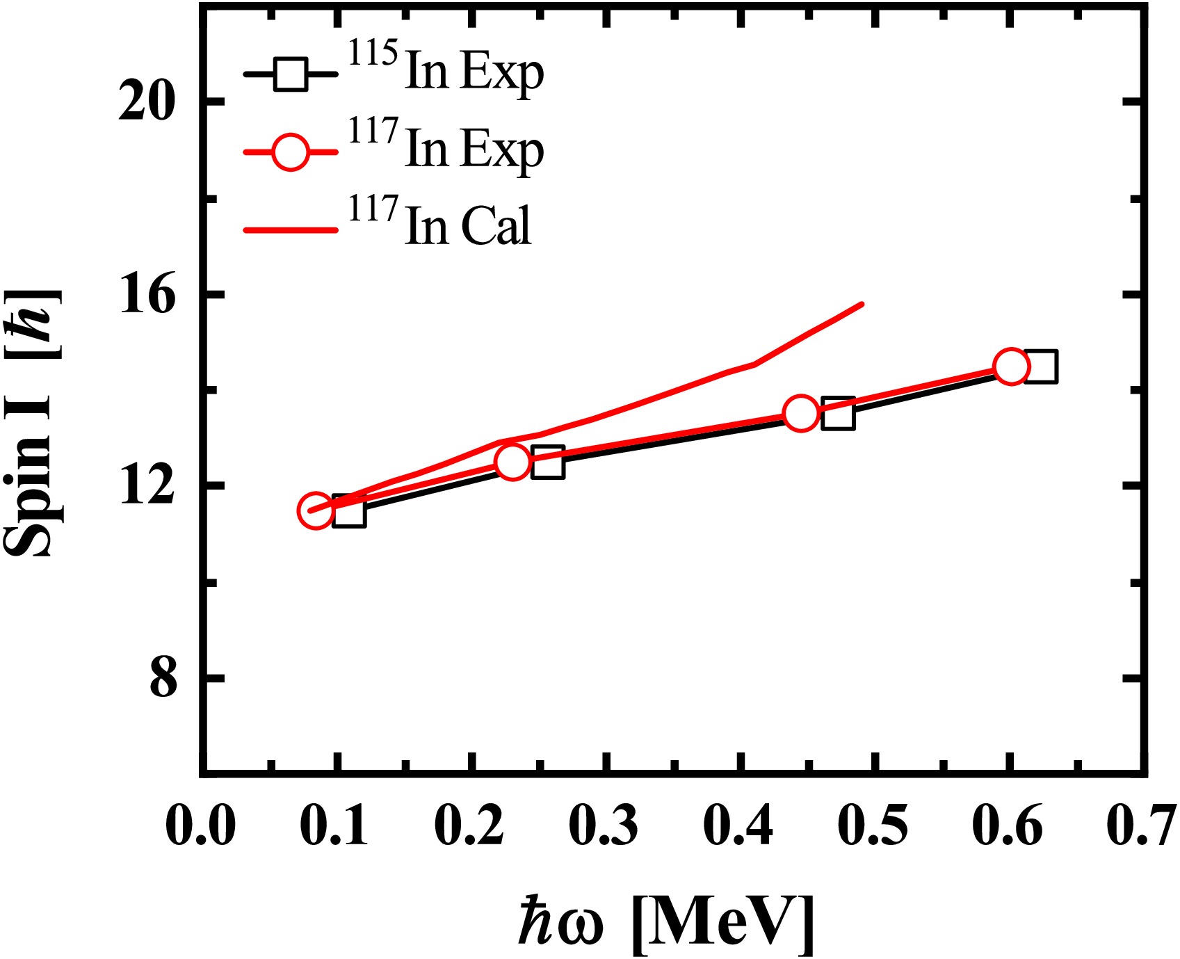 Figure 6.  (color online) Calculated spins as a function of rotational frequency obtained from the TAC-CDFT calculations in comparison with the experimental data for the structure C of $ ^{117} {\rm{In}}$, together with the data of the band with the $ \pi g_{9/2}^{-1} \otimes \nu h_{11/2}^{2} $ configuration in $ ^{115} {\rm{In}}$. The experimental values are extracted from the relation $ \hbar \omega $ = [E(I+1)-E(I-1)]/2.
