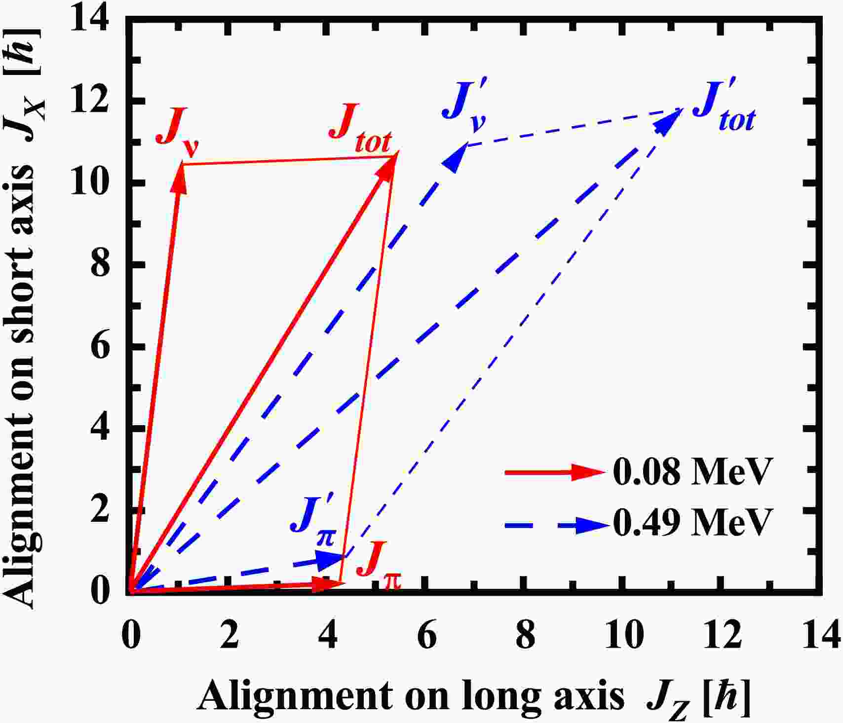 Figure 7.  Compositions of the proton, neutron, and total angular momentum vectors $ J_{\pi} $, $ J_{\nu} $, and $ J_{tot} $ = $ J_{\pi} $ + $ J_{\nu} $ at both rotational frequencies of 0.08 and 0.49 MeV for the $ \pi g_{9/2}^{-1} \otimes \nu h_{11/2}^{2} $ configuration in the TAC-CDFT calculations.