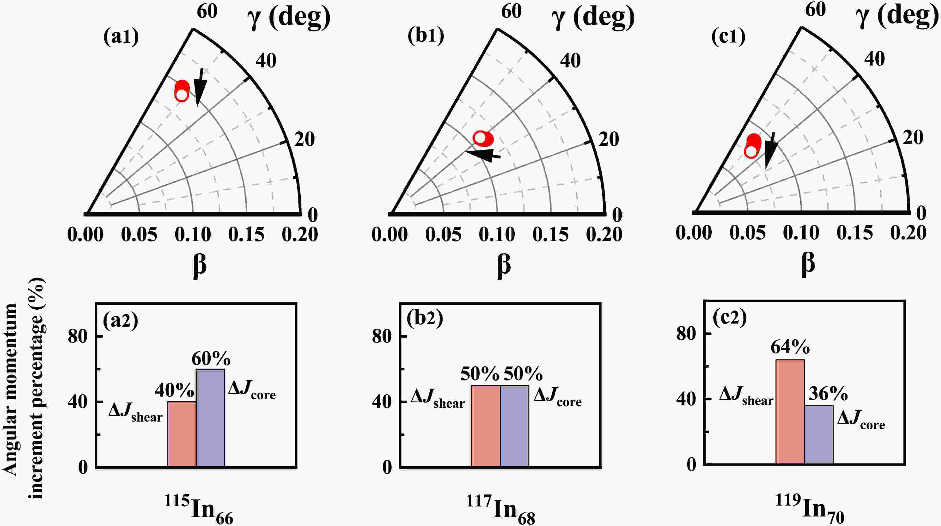 Figure 8.  (color online) Evolution of the deformation parameters $ \beta_2 $ and γ driven by increasing rotational frequency in the TAC-CDFT calculations for the "stapler" bands of (a1) $ ^{115} {\rm{In}}$, (b1) $ ^{117} {\rm{In}}$, and (c1) $ ^{119} {\rm{In}}$. The arrow indicates the increasing direction of the rotational frequency from 0.08 to 0.36 MeV. The percentages of the contributions to the total angular momentum increment for the rotational frequency of 0.08 to 0.36 MeV from the shears mechanism $ \Delta J\mathrm{_{shear}} $ and core rotation $ \Delta J\mathrm{_{core}} $ in the "stapler" bands of (a2) $ ^{115} {\rm{In}}$, (b2) $ ^{117} {\rm{In}}$, and (c2) $ ^{119} {\rm{In}}$.