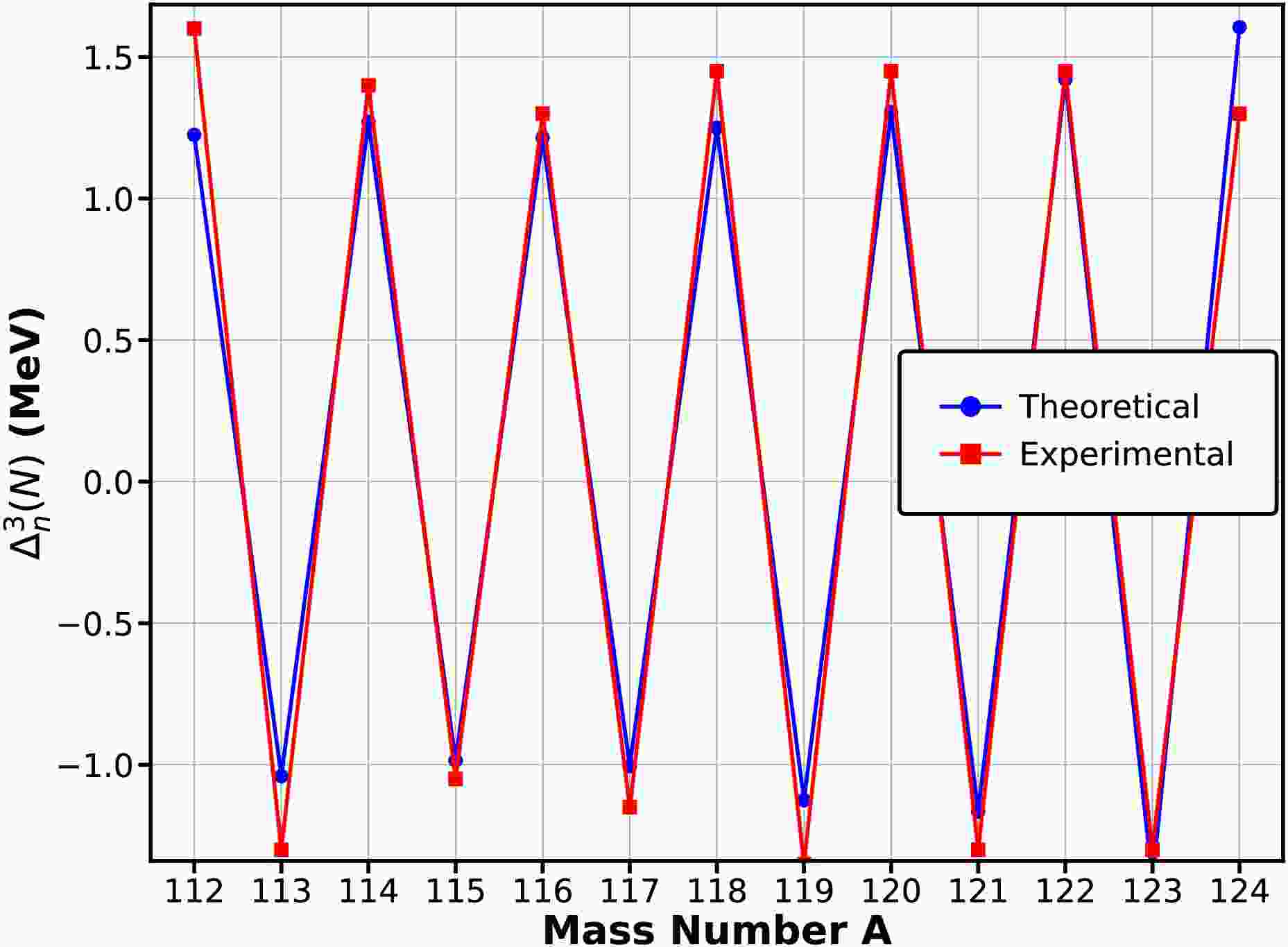 $ \Delta_n^{(3)}(N) $ for Sn isotopes ranging from 111Sn to 124Sn are presented and compared with experimental data in Figure 1. The RHB calculations reproduce the characteristic odd–even staggering pattern along the isotopic chain, with pairing gaps of the correct order of magnitude. The remaining deviations, typically within a few hundred keV, reflect the sensitivity of the three-point indicator to local shell effects and the single-particle level spacing near the Fermi surface.