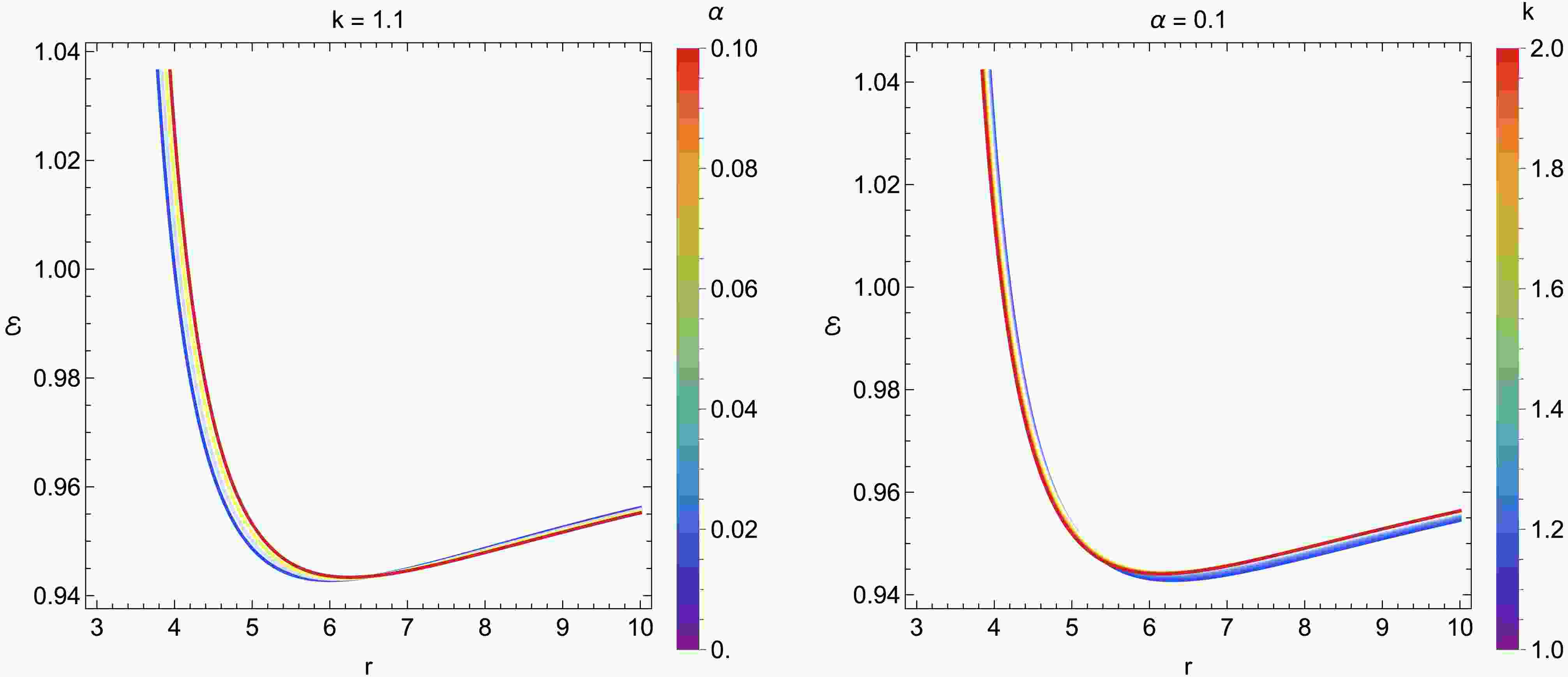 $ {{\cal{E}}} $ corresponding to circular equatorial orbits in the same background. Also, the plot indicates that for circular orbits, the energy initially increases when the BH parameter α increases, but after a certain stage it starts to decline for larger α. A comparable trend is obtained when the parameter is changed k. In addition to this, the figure also shows that the energy$ {{\cal{E}}} $ of the particles grows as the orbital radius r increases.
