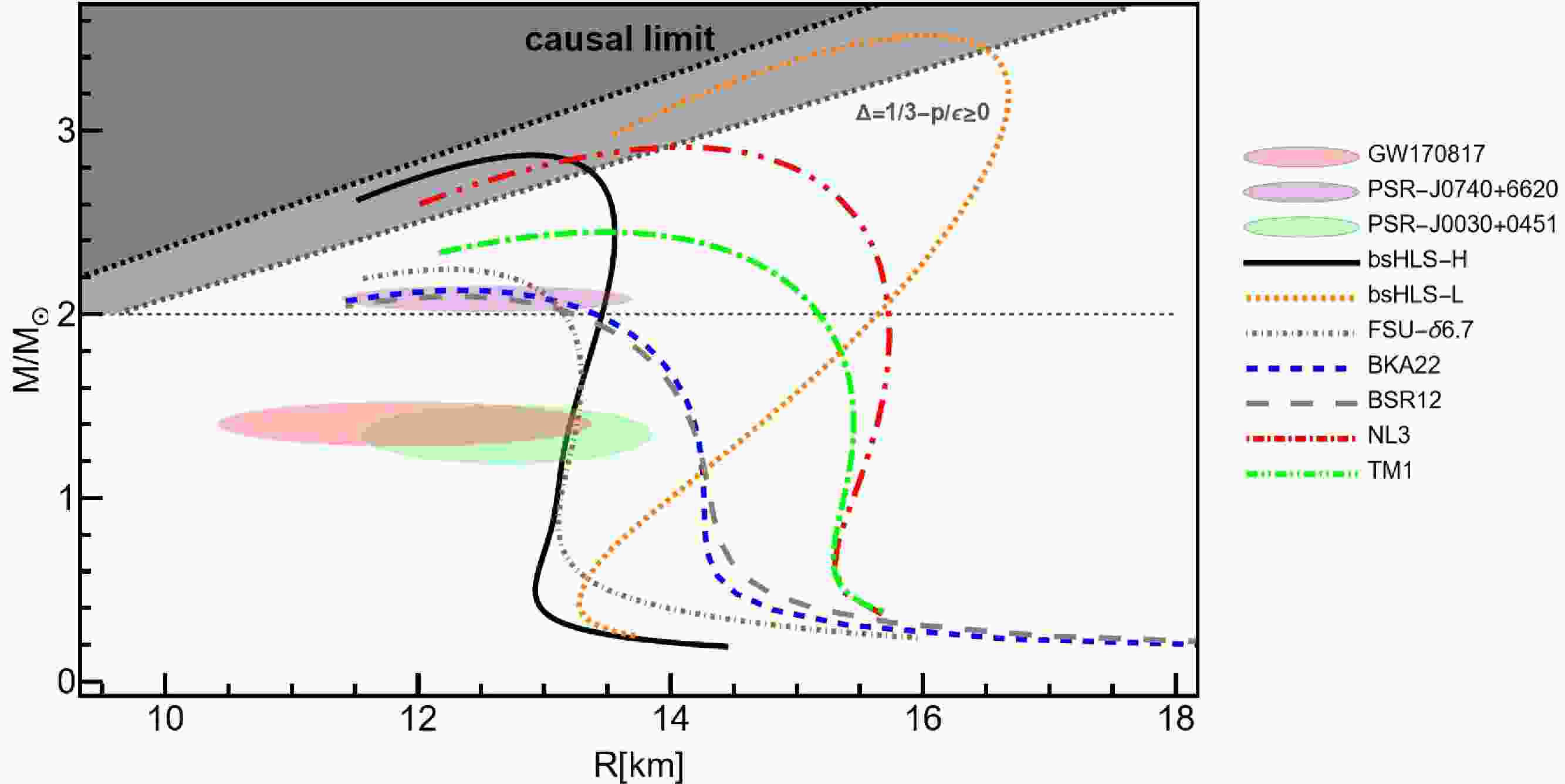For bsHLS-H, it predicts a M-R relation falls within the constraints of astro-observations with an obviously larger maximum mass around $2.8 M_{\odot}$, compared to Walecka-type models: When meeting the NS constraints, the $M_{\rm{max}}$ of NSs predicted by these Walecka-type models is around or slightly above $2.2 M_{\odot}$, as discussed in Refs. [5052, 79, 80].