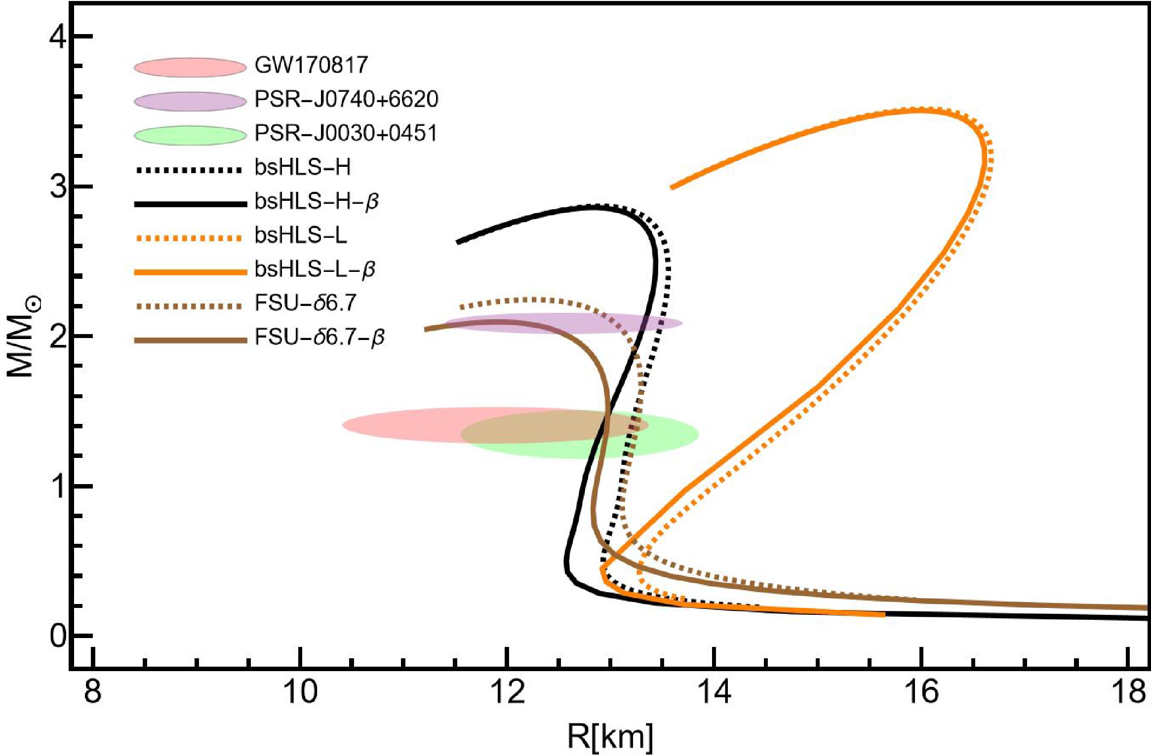In order to show the rationality of the above discussions, we also plot the M-R relations in beta equilibrium matter—a more realistic case but beyond the present framework—in Fig. 3. One can see that the maximum mass of a NS doesn't change much, while the M-R relations all become more compact, favored by observations. So, the inclusion of beta equilibrium matter doesn't change the main conclusion drawn above.
