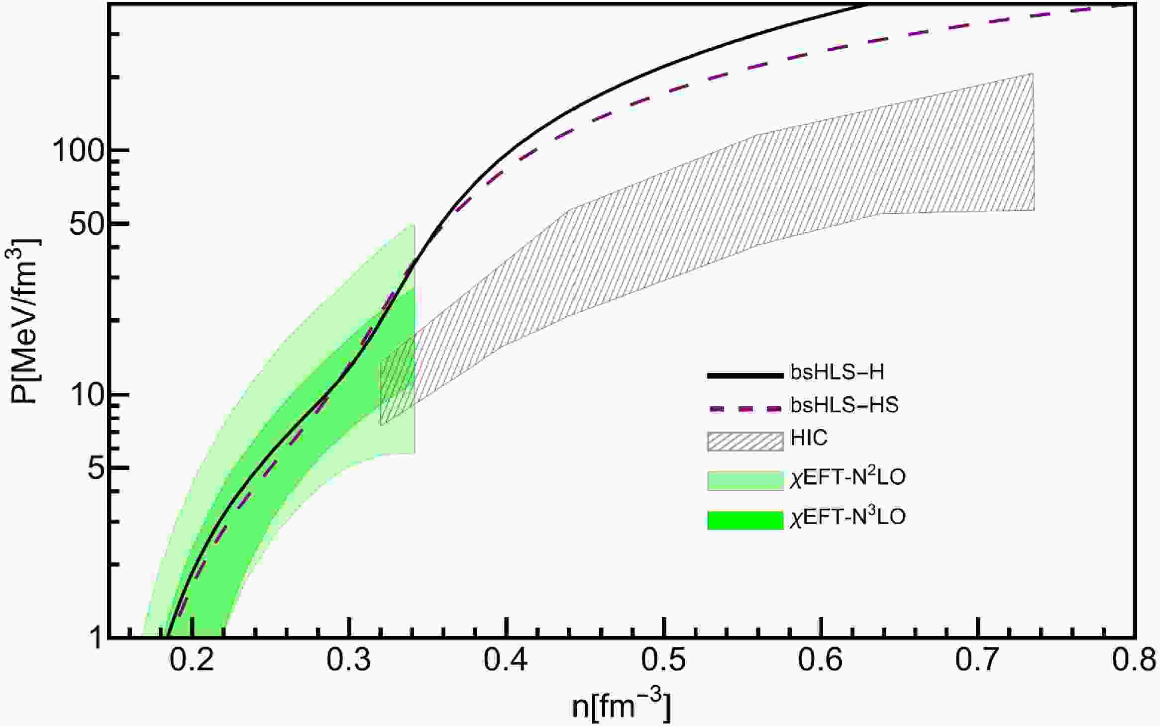 It can be seen that the symmetry energy remains almost the same in both cases. However, the incompressibility of bsHLS-HS is much softer than that of bsHLS-H at high densities, leading to a decrease in $M_{\rm{max}}$. And it gives us a hint to find a model compatible with the HIC SNM pressure constraint by introducing a suppression factor as shown in Fig. 8, which also provides the rationality from the phenomenological side to add such suppression at high densities.