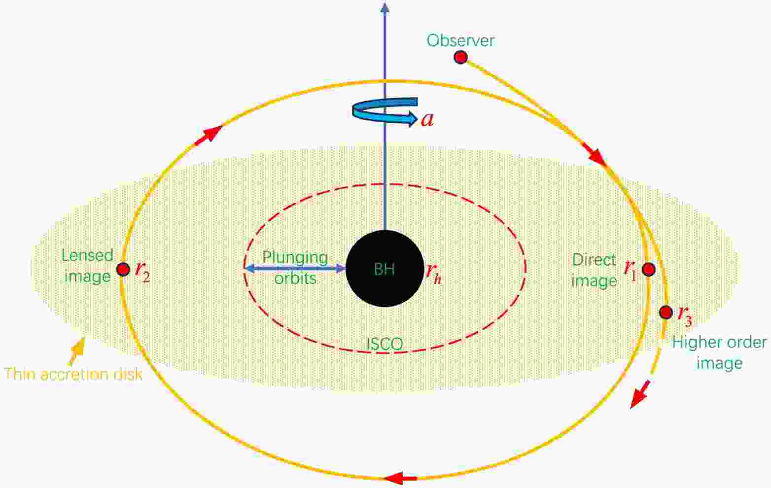 • In the previous section, we discussed the black hole shadow image under the spherical light source model. However, in reality, there is an accretion disk around the black hole, so studying the black hole shadow image illuminated by the accretion disk as a light source is of greater significance. For simplicity, we assume the accretion disk is optically and geometrically thin and located in the equatorial plane, with the observer sufficiently far away, i.e., $ \theta_o = \pi/2, r_o \gg M = 1 $. The accretion disk consists of free electrically neutral plasma moving along timelike geodesics in the equatorial plane. Matter that is accreted by the black hole will fall into the event horizon if it is too close to the black hole; if it is far enough, it may orbit the black hole along a stable orbit. To more intuitively describe this phenomenon, we introduce the concept of the innermost stable circular orbit (ISCO). The ISCO is located at the inner edge of the accretion disk and is the last region where matter can safely orbit without falling into the event horizon. The accretion disk is divided into two regions by the ISCO: inside the ISCO, the accreting material falls into the event horizon along plunging orbits, while outside the ISCO, the accretion disk material orbits the black hole along a Keplerian orbit. On the other hand, according to the reference [44], light rays may interact with the accretion disk multiple times, with each interaction increasing the brightness of the black hole shadow image. We denote the position where the photon interacts with the accretion disk for the nth time as $ r_n $ ($ n = 1, 2, 3, \dots $). When $ n = 1 $, the resulting image is called the direct image; when $ n = 2 $, it is called the lensed image; when $ n>2 $, it is called the higher-order images. Since direct and lensed images contribute more than 95% to the total luminosity, this paper mainly focuses on the cases of $ n = 1 $ and $ n = 2 $, i.e., direct and lensed images. It is worth noting that regardless of changes in reflection effects or the thickness of the accretion disk, the above phenomena always occur. In Figure 10, we show a schematic of the black hole imaging with the thin accretion disk as the light source.