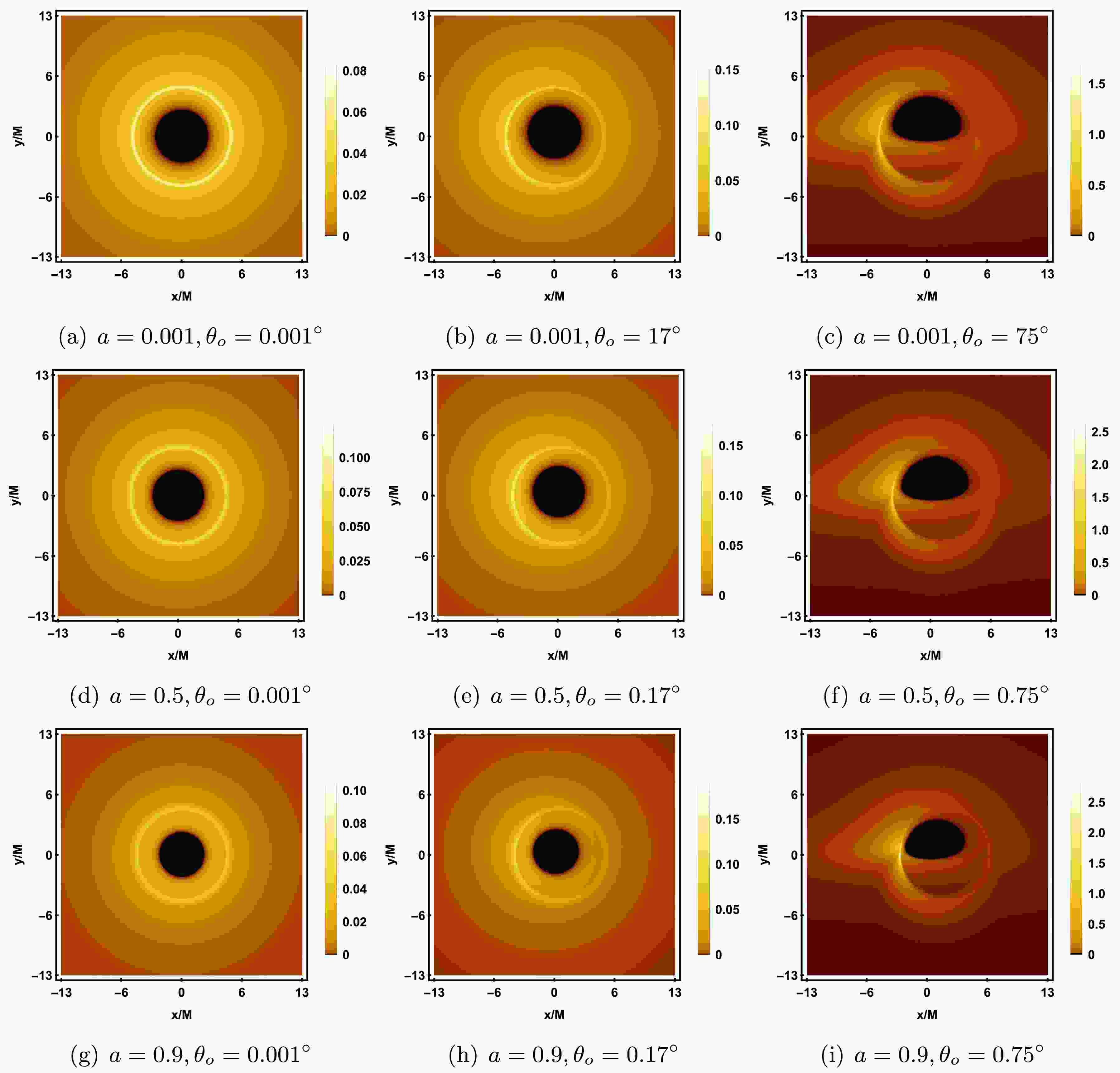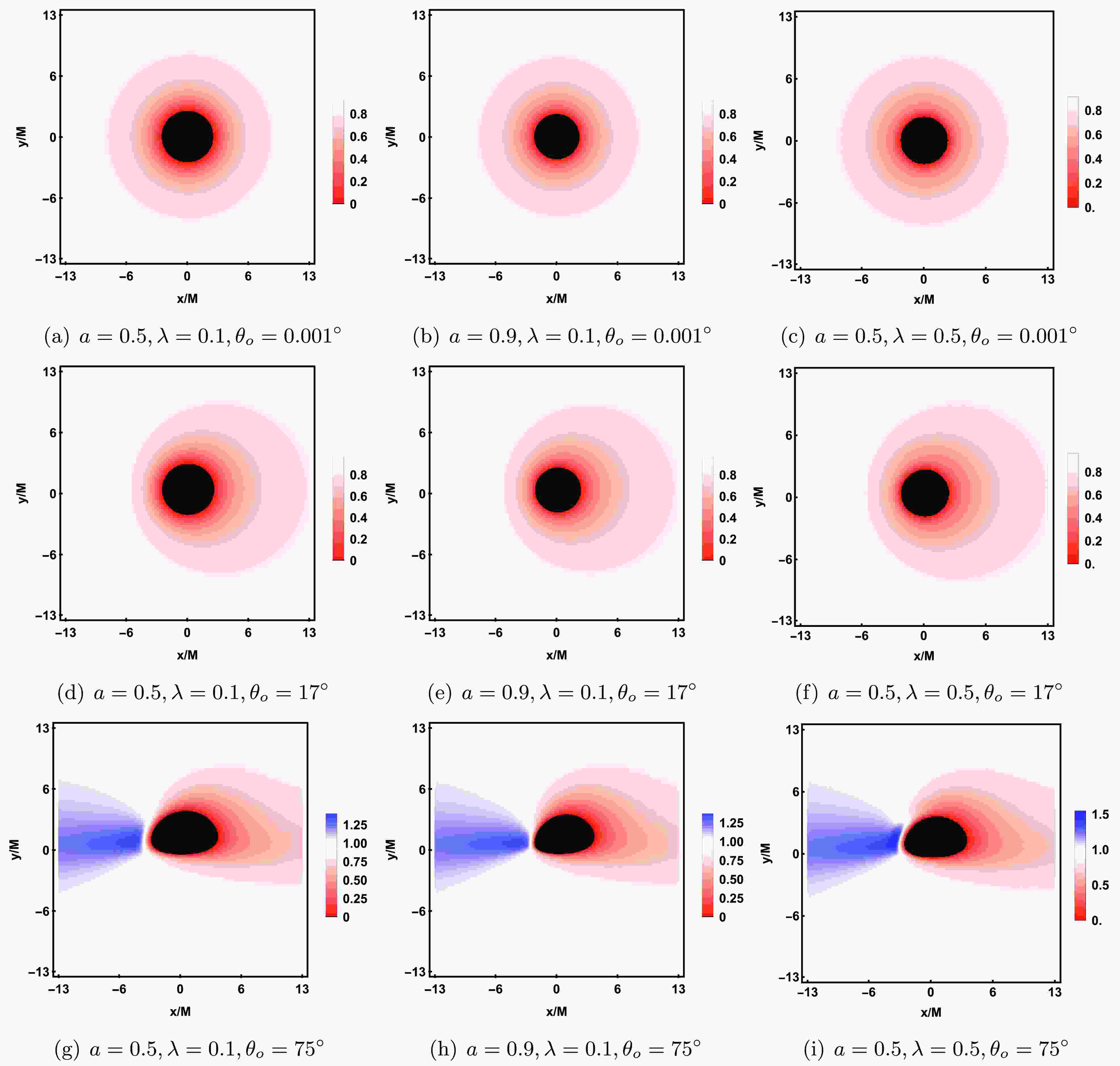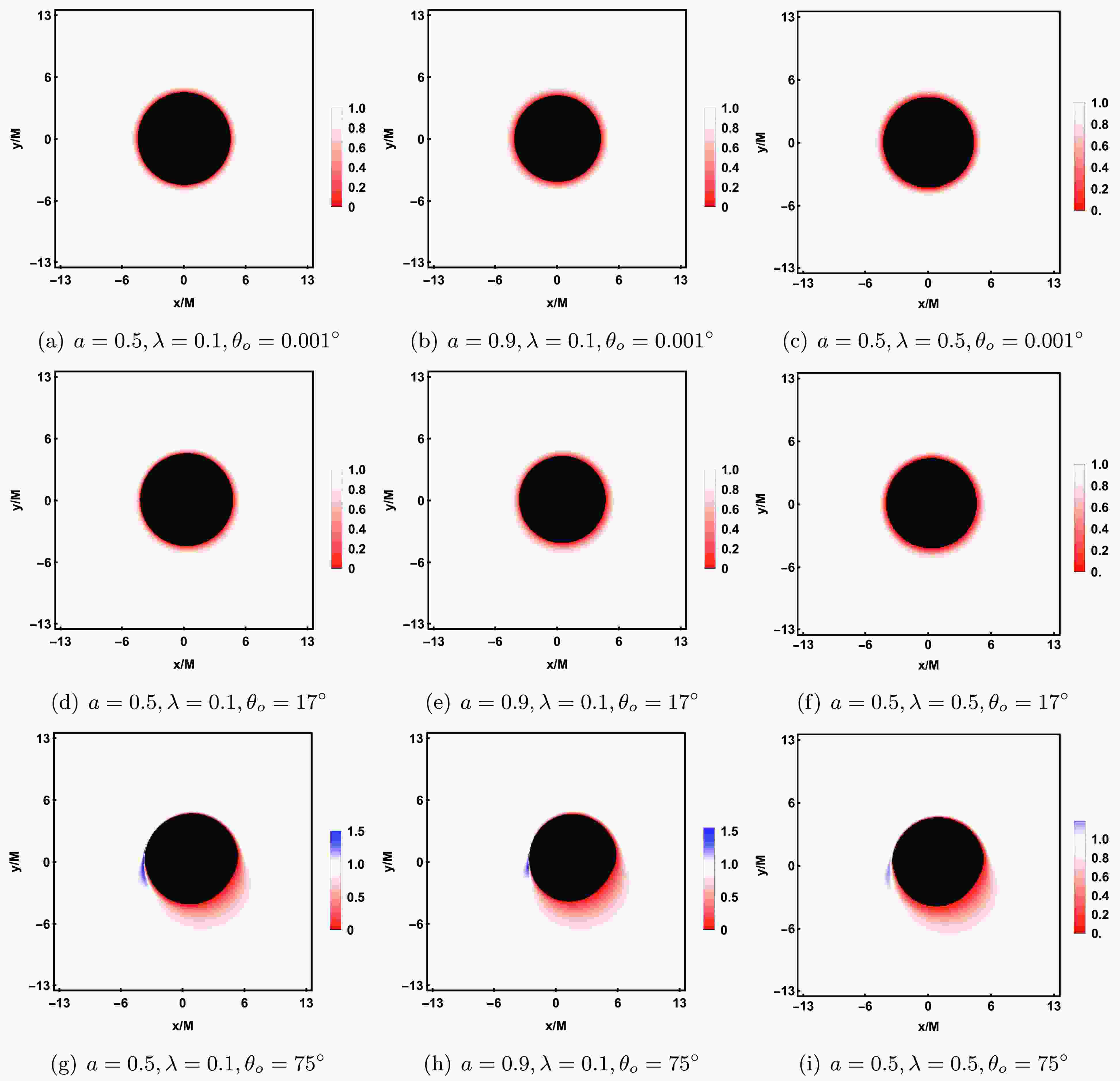The black hole shadow images corresponding to different rotation parameters a are shown in Figure 11. From top to bottom in each row, the values of a are $ 0.001 $, $ 0.5 $, and $ 0.9 $, with $ \lambda = 0.1 $ and $ {\cal{G}} = 0.9 $ fixed. In the center of each image, a black region, called the inner shadow, can be observed [45]. When the photon directly falls into the event horizon without passing through the equatorial plane, we have $ {\cal{I}}_{o} = 0 $ according to equation (59), and thus the pixels corresponding to the inner shadow are black, reflecting the fact that the black hole's strong gravity prevents the photon from escaping. Outside the inner shadow, there is a luminous ring, called the photon ring. When the observer's inclination angle $ \theta_o = 0.001^{\circ} $ (the first column), the inner shadow appears as a perfect circle, and the photon ring is a symmetric circle with the same center as the coordinate origin. This is because as $ \theta_o \to 0^{\circ} $, the observer's line of sight becomes perpendicular to the equatorial plane, aligned with the accretion disk and the black hole's rotation axis. In this case, the radial velocity of each point on the accretion disk relative to the observer is nearly zero, and there is almost no Doppler redshift; the observed redshift is primarily due to gravitational redshift. When $ \theta_o = 17^{\circ} $ (the second column), the inner shadow undergoes slight deformation and is no longer a perfect circle, with the center of the photon ring shifting downward to the right. As $ \theta_o $ increases to $ 75^{\circ} $ (the third column), the deformation of the inner shadow becomes more pronounced, appearing in a D-shaped, and a crescent-shaped bright area appears on the left side of the photon ring, with brightness significantly higher than the surrounding regions. The prograde accretion disk causes the photons from the left side to move towards the observer, producing a blueshift, increasing the photon energy and brightening the shadow image. The photons from the right side move away from the observer, producing a redshift, decreasing the photon energy and dimming the shadow image. Furthermore, by comparing the images in each row, we can see that as a increases, the inner shadow gradually becomes smaller, while the brightness of the photon ring increases. In particular, when $ \theta_o = 75^{\circ} $, increasing a further enhances the dragging effect of the black hole on the background celestial sphere and the Doppler effect, causing the size and brightness of the crescent bright area on the left to gradually increase.