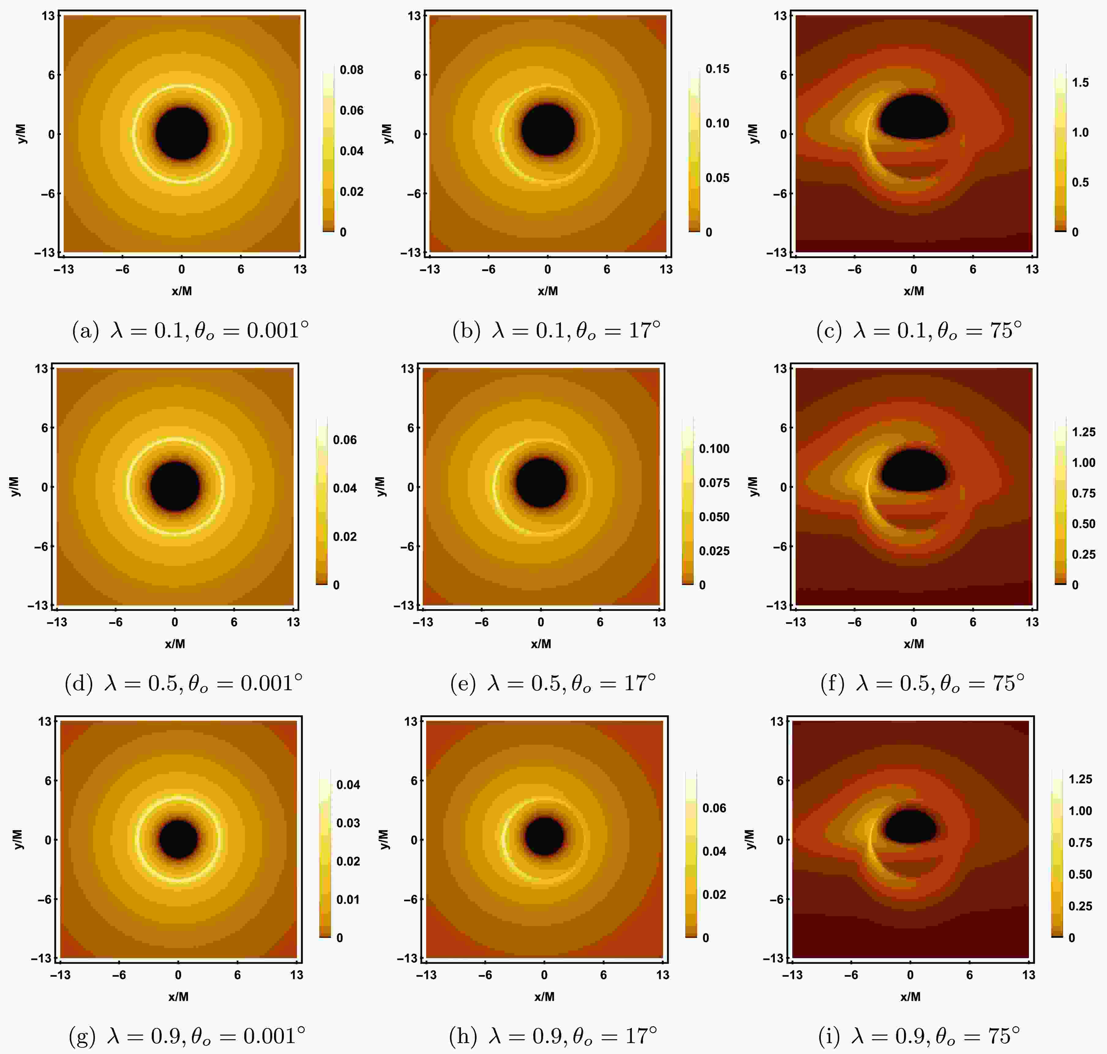 The impact of the spontaneous Lorentz symmetry violation parameter λ on the black hole shadow image is shown in Figure 13, with the corresponding observed flux shown in Figure 14. Each row, from top to bottom, corresponds to $ \lambda = 0.1, 0.5, 0.9 $, and each column, from left to right, corresponds to the observer inclination angles $ \theta_o = 0.001^{\circ}, 17^{\circ}, 75^{\circ} $, with other parameters fixed as $ M = 1, a = 0.001, {\cal{G}} = 0.9 $. From Figure 13, it can be seen that as λ increases, the radii of the inner shadow and the photon ring both decrease, but the brightness of the photon ring gradually increases. As $ \theta_o $ increases, the inner shadow undergoes noticeable deformation, evolving from a symmetric circle into a D-shaped. When $ \theta_o \to 0^{\circ} $ (the first column), the brightness distribution of the photon ring is uniform; when $ \theta_o $ increases to $ 75^{\circ} $ (the third column), a crescent-shaped bright area appears on the left side of the photon ring, with the intensity clearly higher than the right side, making the direct image and lensed image from the accretion disk clearly distinguishable. Furthermore, at $ \theta_o = 75^{\circ} $, a slight clockwise rotation of the inner shadow around the x-axis can also be observed. From Figure 14, it can be seen that an increase in λ slightly reduces the range of lensed image and the photon ring. As $ \theta_o $ increases, the lensed image gradually shifts towards the lower half of the screen, and when $ \theta_o = 75^{\circ} $, the range of lensed image even extends beyond the screen. Meanwhile, the photon ring in the upper half of the screen becomes sparse, while the photon ring in the lower half becomes more prominent.