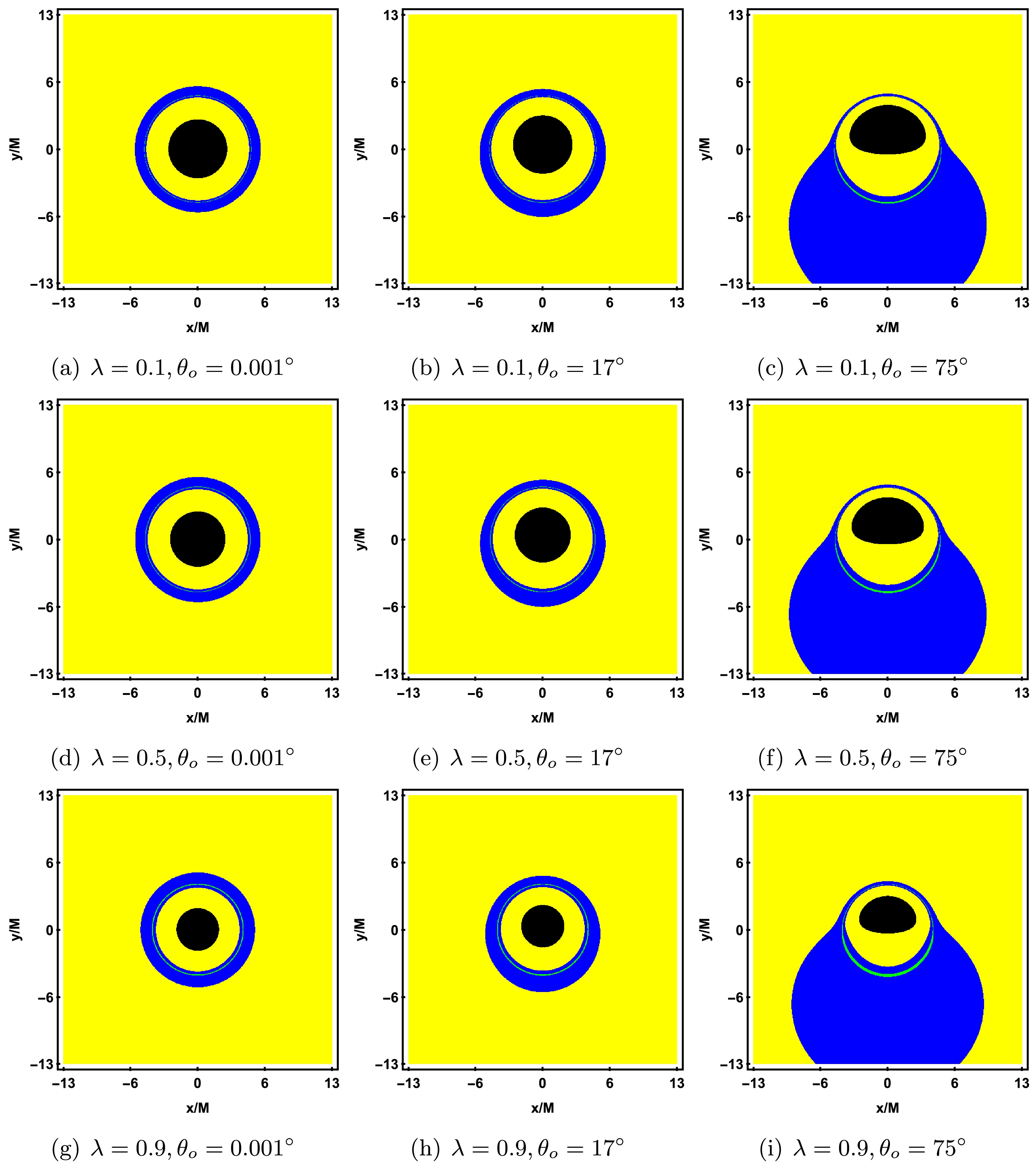 Figure 14.  (color online) Observed flux of the direct image, lensed image, and photon ring with a prograde thin accretion disk in KR gravity. The black, yellow, blue, and green regions correspond to the inner shadow, direct image, lensed image, and photon ring, respectively. Each row shows the gradual increase of λ, and each column shows the gradual increase of the observer's inclination angle $ \theta_o $. The other parameters are fixed as $ M = 1, a = 0.001, {\cal{G}} = 0.9 $.