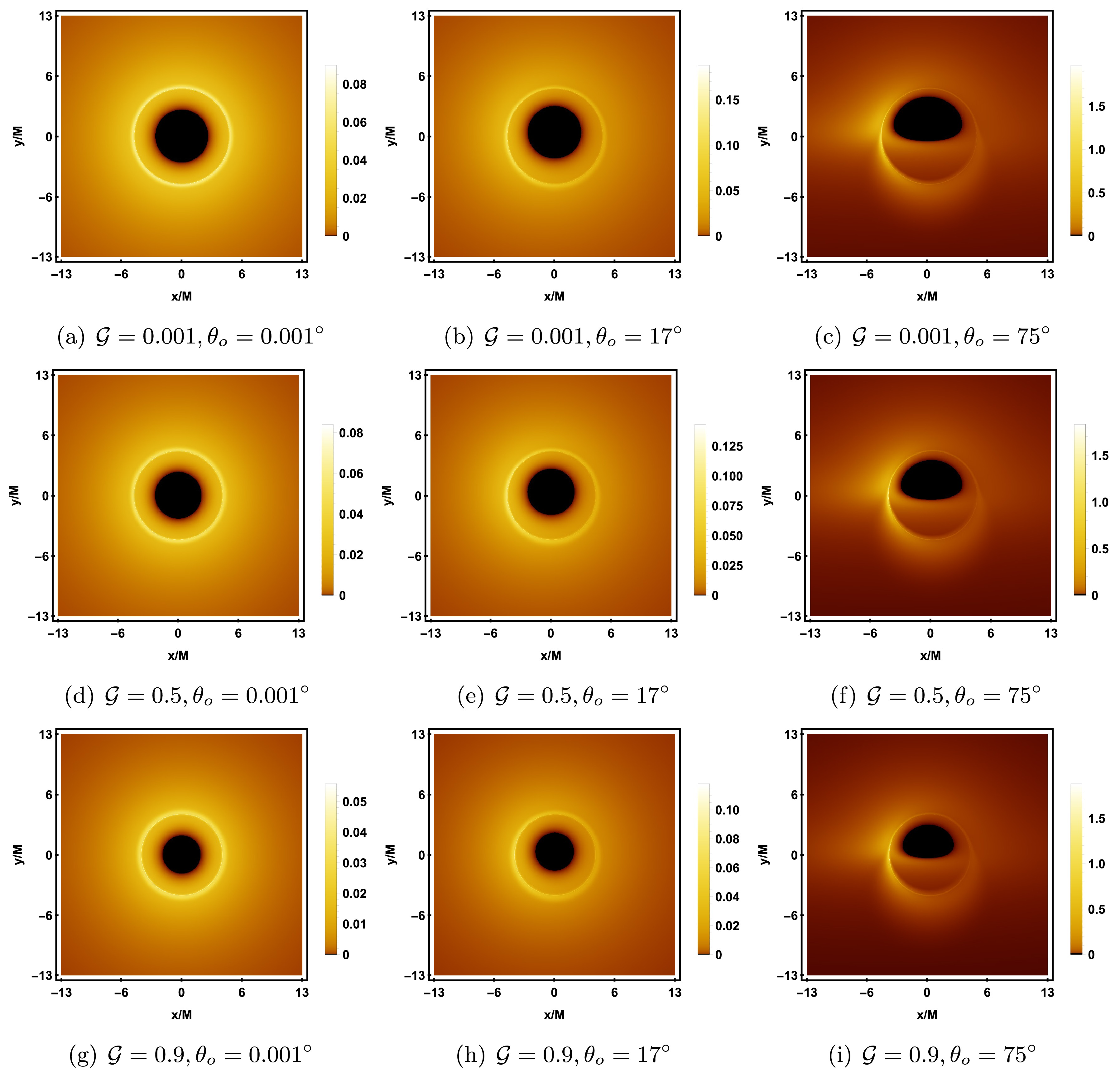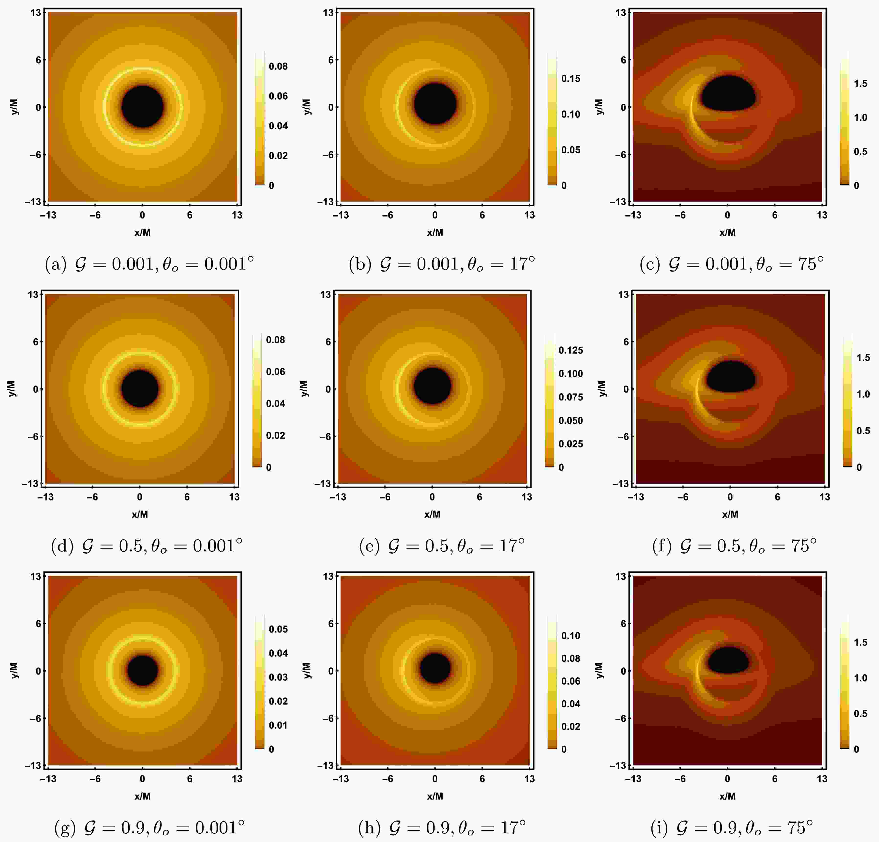 Next, we will focus on discussing the impact of the spontaneous Lorentz symmetry violation parameter $ {\cal{G}} $ on the black hole shadow image. As shown in Figure 15, with the increase in $ {\cal{G}} $, both the size of the inner shadow and the radius of the photon ring decrease significantly, but their shapes remain nearly unchanged. Additionally, from the colorbar, it can be seen that the image's brightness decreases. As the observer's inclination angle $ \theta_o $ increases, the shape of the inner shadow gradually changes from a circle to an ellipse and eventually evolves into a D-shaped. Similar to the cases of a and λ, when $ \theta_o = 75^{\circ} $, due to the Doppler effect, the brightness on the left side of the photon ring is significantly higher than that on the right side. The corresponding observed flux of Figure 15 is shown in Figure 16. It can be observed that when $ {\cal{G}} $ and $ \theta_o $ are small, the photon ring in the image is not prominent. As $ {\cal{G}} $ and $ \theta_o $ increase, the lensed image and the photon ring gradually shift towards the lower half of the screen, and the brightness of the photon ring becomes more prominent.