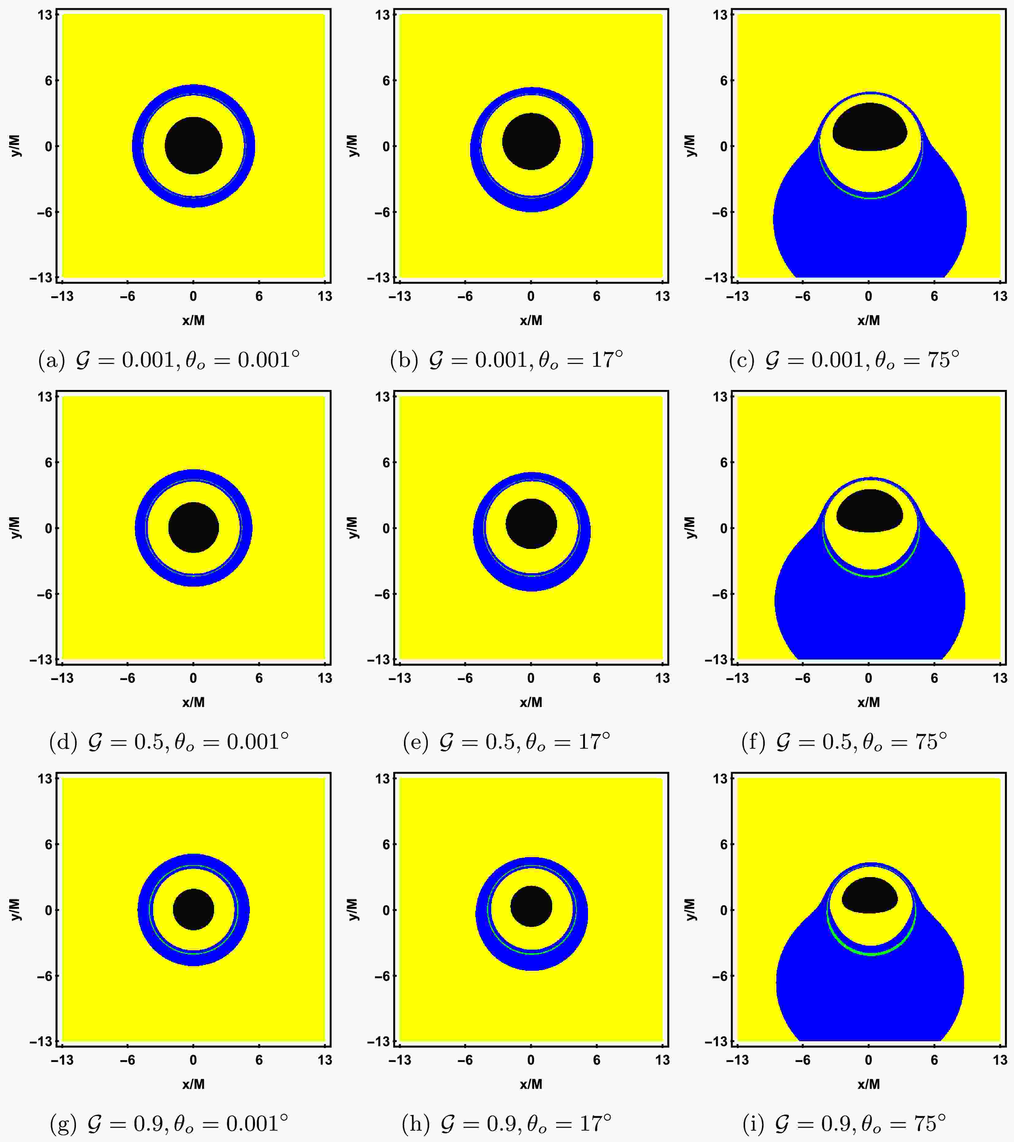 It is important to note that in the optical image of a black hole, variations in the number of times light ray traverses the accretion disk result in distinct images due to the cumulative effect of light intensity at each passage. Specifically, the primary image (direct image) corresponds to the case where $ n = 1 $, the secondary image (lensed image) corresponds to $ n = 2 $, and paths involving three or more crossings correspond to higher-order images (photon rings). The definition of photon rings is generally subject to variation. For instance, according to Refs. [84, 85], the photon ring includes all images located outside the direct image. In contrast, Refs. [41, 42] define the term more narrowly, referring specifically to images situated beyond both the primary and secondary images. In this work, we adopt the definition provided in the latter set of references. To better distinguish between direct and lensed images in the shadow image, we plot the observed fluxes in Figure 12. The yellow, blue, and green regions in the image correspond to direct image, lensed image and the photon ring, respectively. For all parameter values, the range of direct image is the widest, while the photon ring always lies within the range of lensed image. When $ \theta_o \to 0^{\circ} $ (the first column), lensed image and the photon ring form concentric circular structures, with the center located at the origin and coinciding with the center of the inner shadow. As a increases, the radius of the rings slightly decreases but remains symmetrical. When $ \theta_o $ increases to $ 17^{\circ} $ (the second column), lensed image and the photon ring shift towards the negative half of the y-axis, and the rings are no longer symmetrical. As $ \theta_o $ further increases to $ 75^{\circ} $ (the third column), both the inner shadow, lensed image, and the photon ring undergo significant deformation. The range of lensed image greatly increases, mainly concentrated in the lower half of the screen, with less distribution in the upper half. Additionally, the photon ring becomes more prominent in the lower half of the screen. These deformations become more pronounced as a increases. The above analysis indicates that the observer's inclination angle $ \theta_o $ has a significant impact on the black hole shadow image, especially the size of the inner shadow and the distribution of the lensed image.