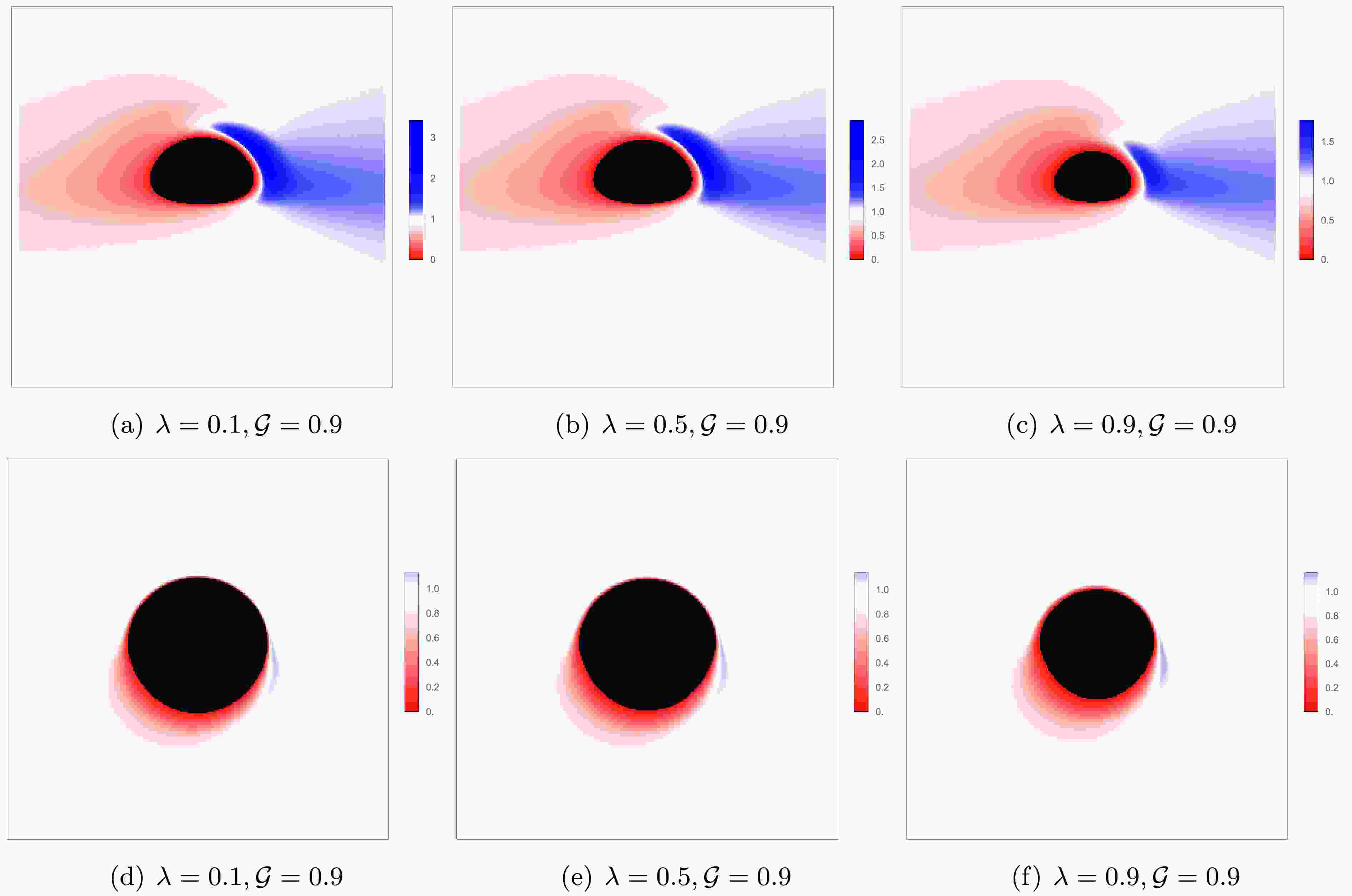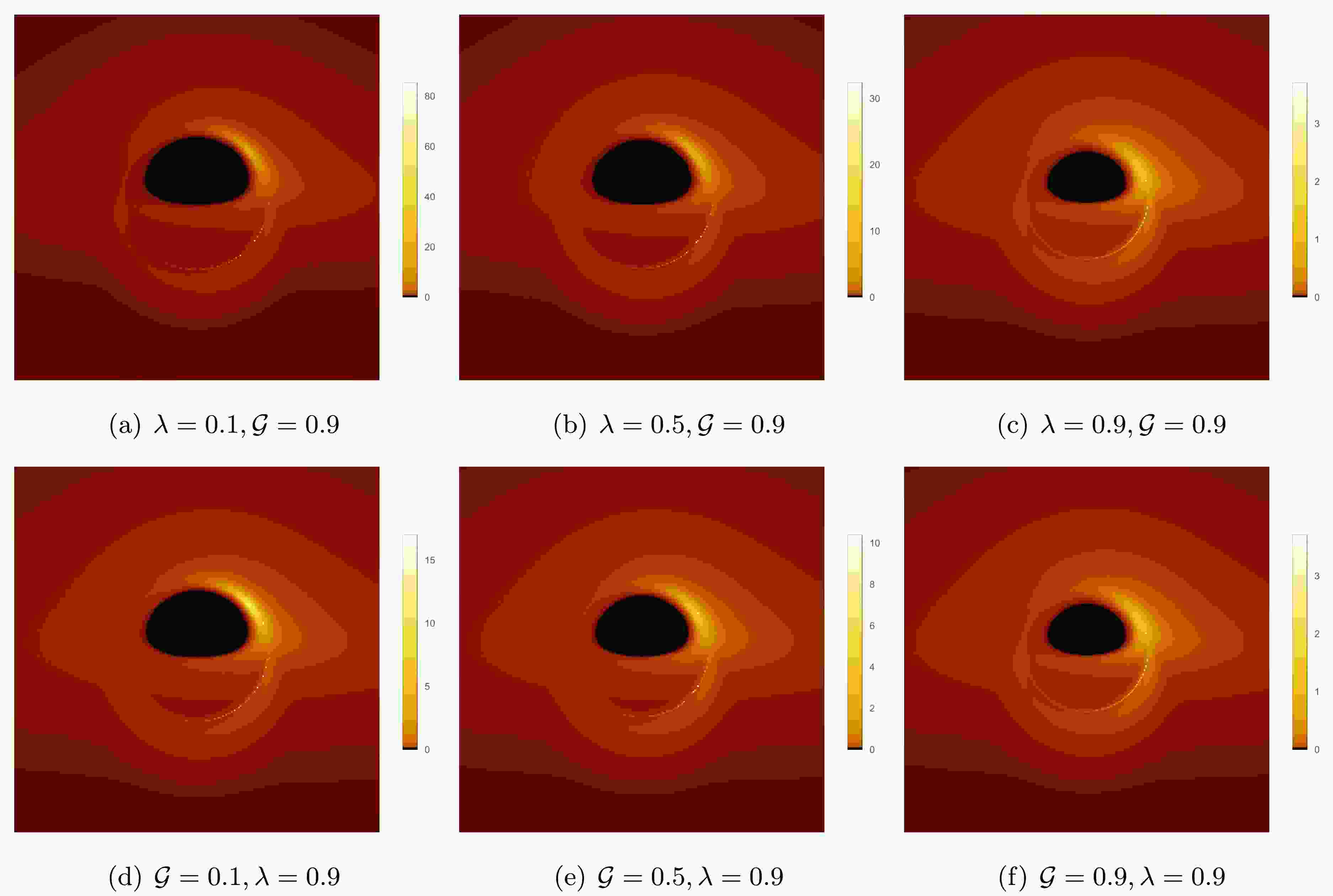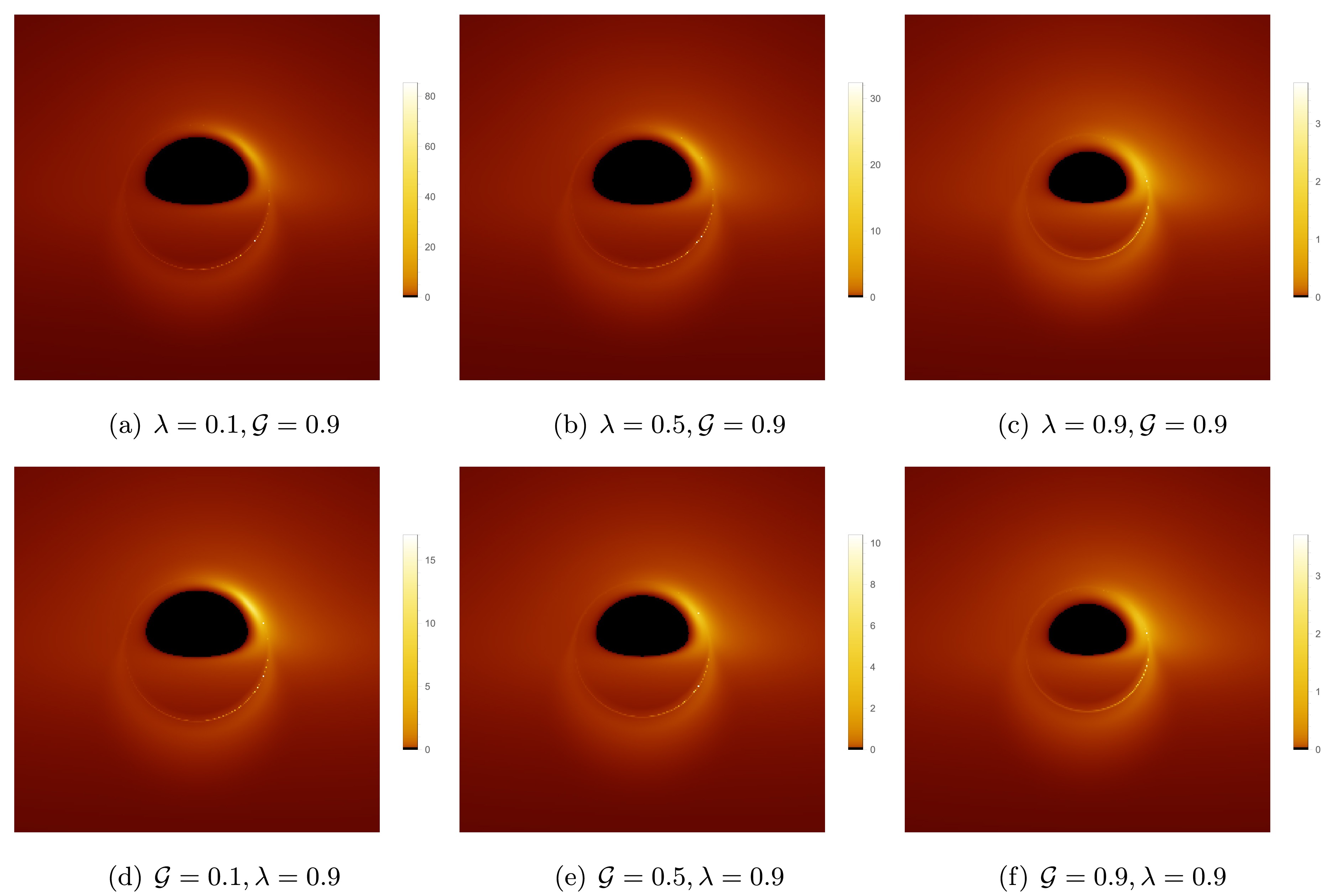 At the end of this section, we will discuss the black hole shadow image illuminated by a retrograde accretion disk as the light source, i.e., the motion direction of the accreting material is opposite to the black hole's spin direction. By comparing the shadow images of the retrograde (Figure 17) and prograde (Figure 13, the third column) accretion disks, it can be observed that, under the same parameter settings, the inner shadow of both cases is identical in shape and size. However, for the retrograde accretion disk, the crescent bright region of the photon ring appears on the right side, which is the opposite of the prograde accretion disk. This is due to the different motion directions of the accreting material relative to the observer, leading to a change in the direction of Doppler redshift. Similar to the prograde accretion disk, as λ or $ {\cal{G}} $ increases, the size of the inner shadow decreases, the distinguishability of the photon ring improves, and the brightness of the crescent bright region increases accordingly.