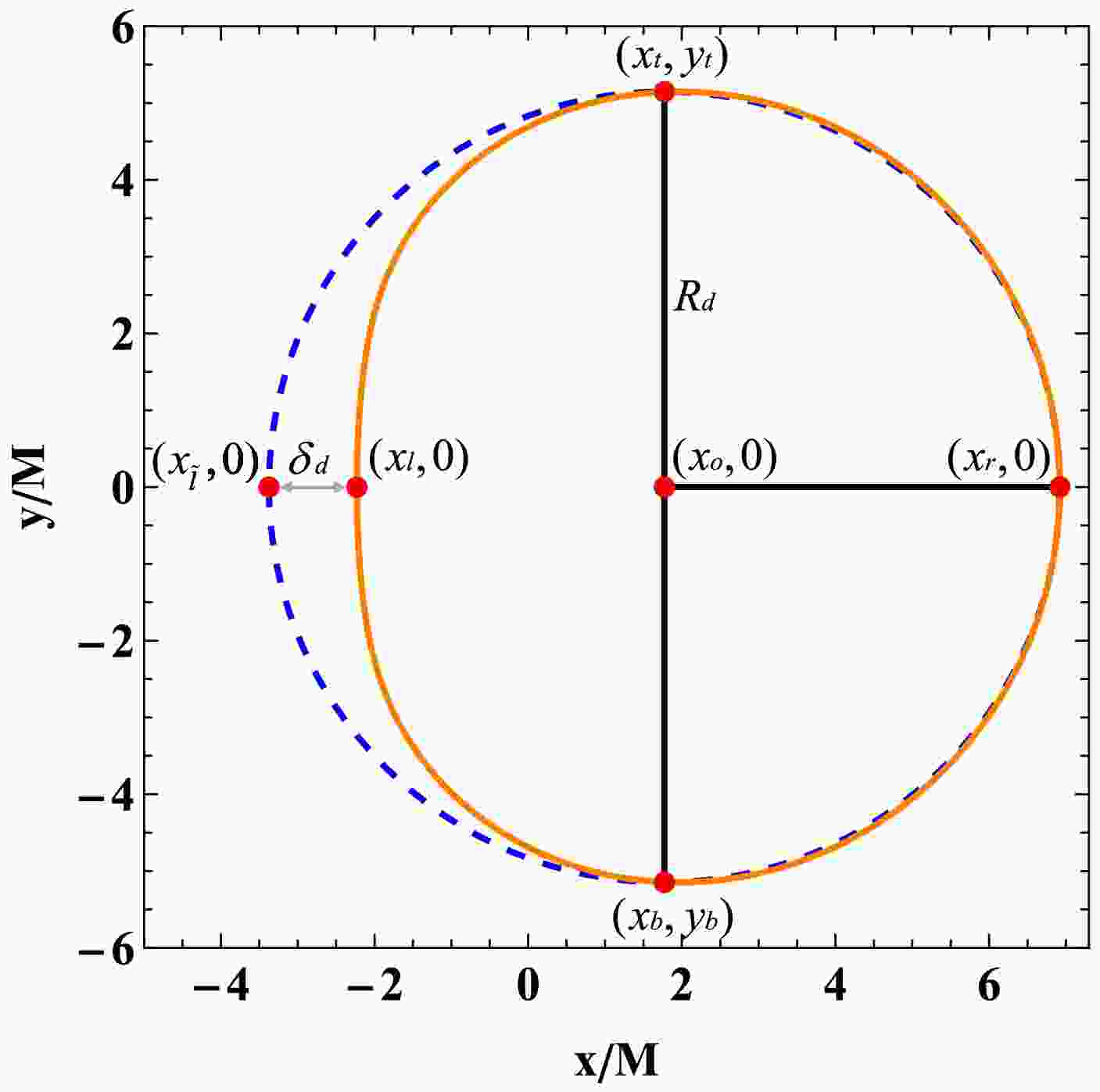 It is easy to see that the metric components do not contain t and ϕ, i.e., $ \dfrac{\partial g_{\mu\nu}}{\partial t} = \dfrac{\partial g_{\mu\nu}}{\partial \phi} = 0 $. Therefore, this is a stationary axisymmetric spacetime with two Killing vector fields $ \left(\dfrac{\partial}{\partial t}\right)^a $ and $ \left(\dfrac{\partial}{\partial \phi}\right)^a $. When $ {\cal{G}} = 0 $ and $ \lambda \neq 0 $ or $ \lambda = 1 $, the metric (8) reduces to the Kerr or Kerr-Newman black hole metrics, respectively. When $ a = 0 $, the metric (8) reduces to the static black hole metric (7). In this paper, we set the black hole mass $ M = 1 $ and specify values for a, λ, and $ {\cal{G}} $. By setting $ \Delta = 0 $, we obtain two solutions, $ r_{\pm} $, which correspond to the event horizon and Cauchy horizon, respectively. The term $ {\cal{G}} r^{\frac{2(\lambda-1)}{\lambda}} $ is found to play a crucial role in horizon dynamics. Variations in the parameters $ {\cal{G}} $ and λ can modify the structure of spacetime geometry, thereby influencing the characteristics of the black hole shadow. Current EHT observations of M87* and Sgr A* are capable of constraining the relevant parameters within alternative theories of gravity. Consequently, by analyzing the angular diameter and degree of deformation of the black hole shadow, permissible ranges for the parameters $ {\cal{G}} $ and λ can be established, as will be discussed in the following sections.