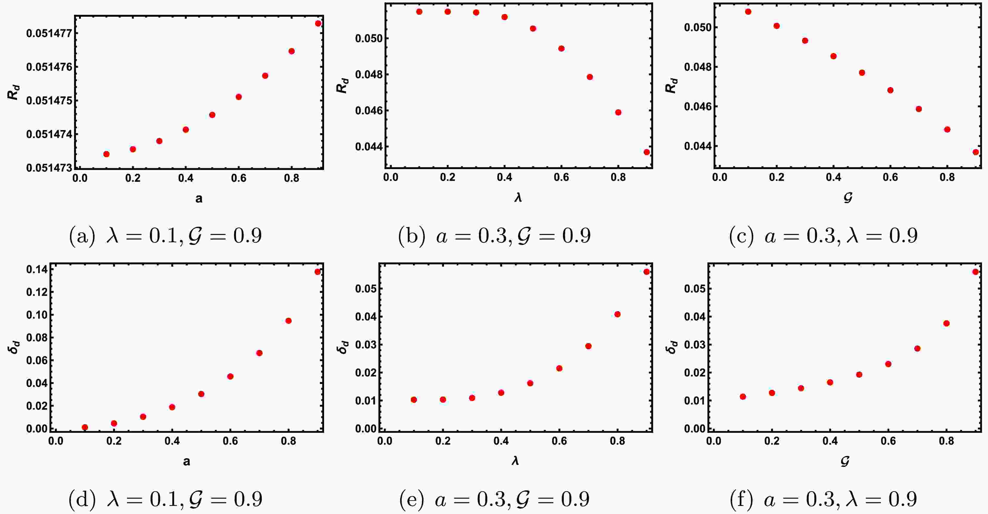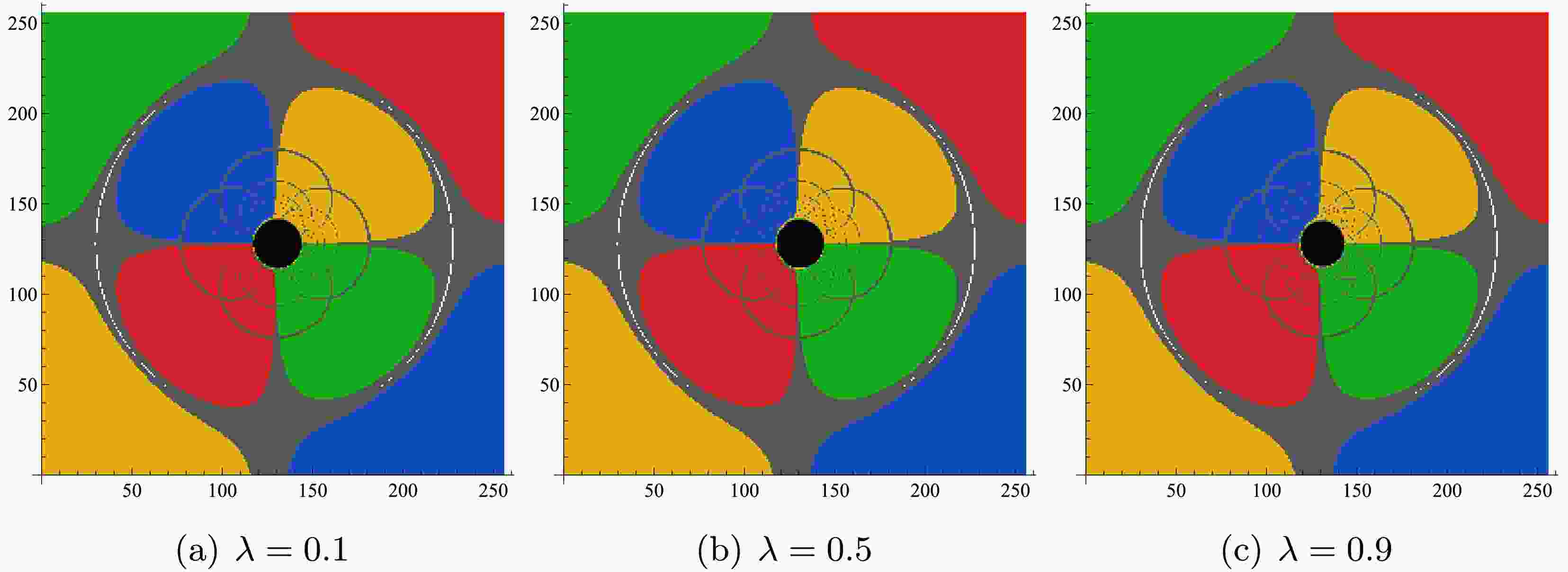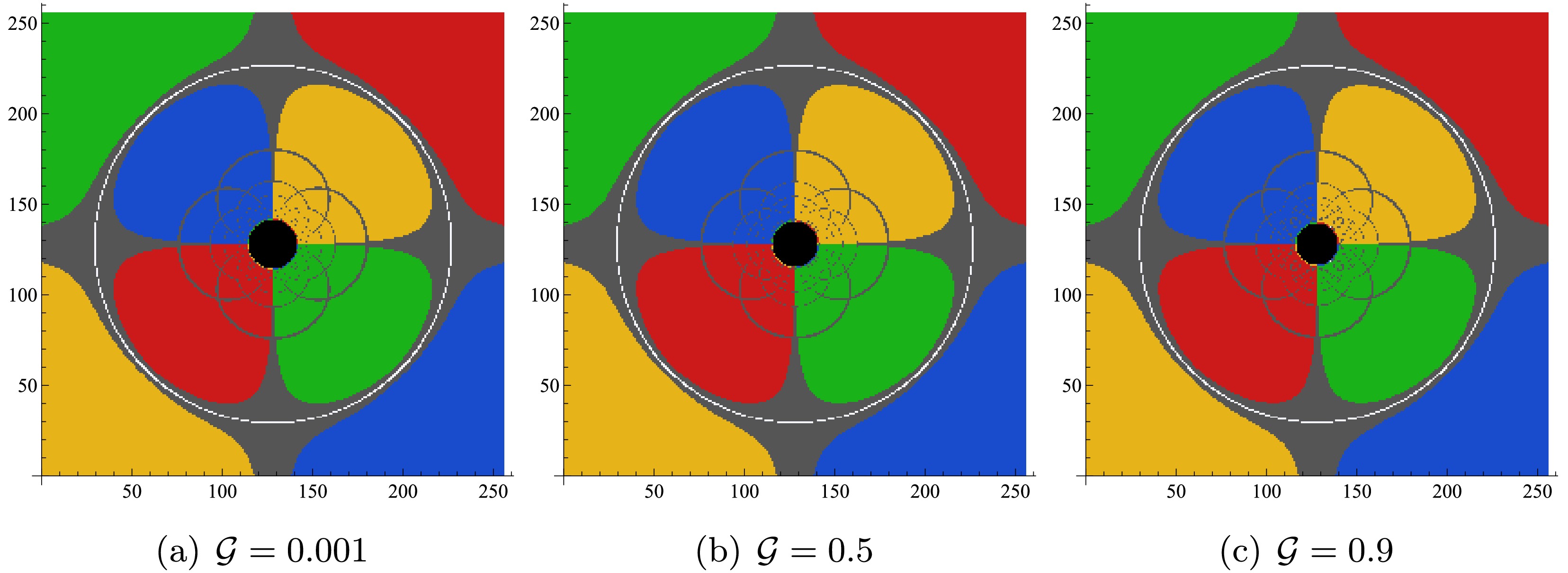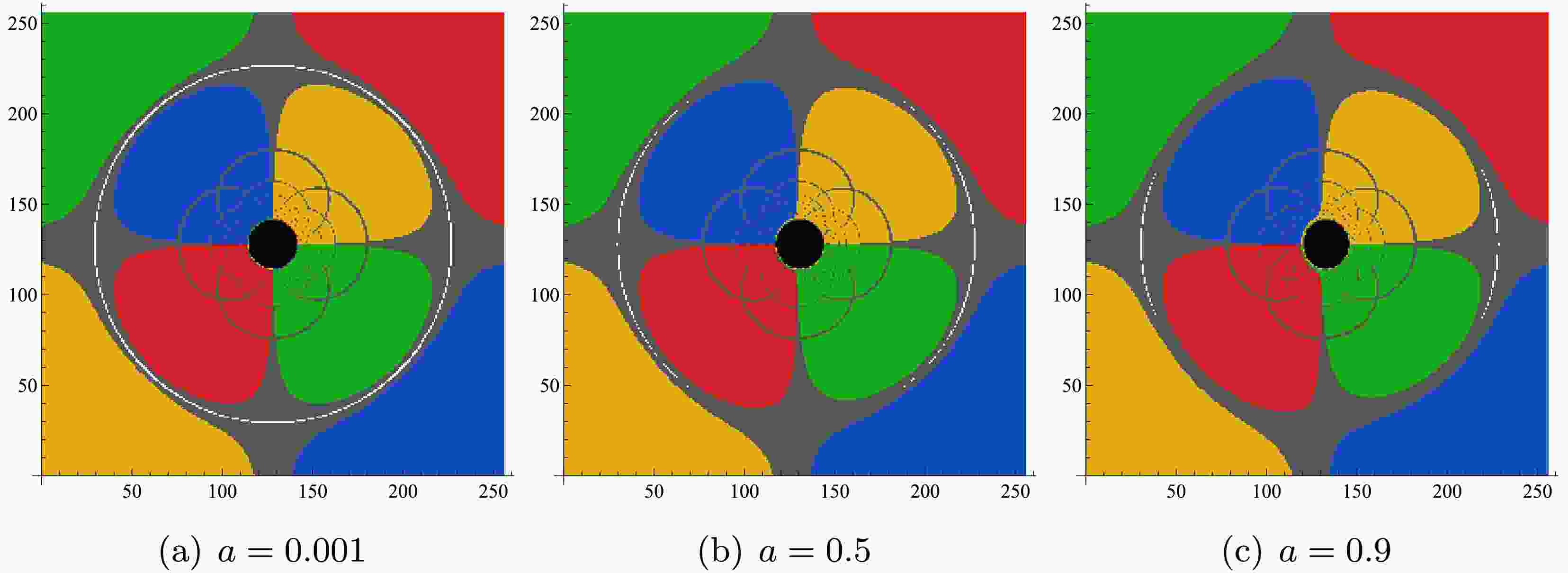 In Figure 7, we fix $ \lambda = 0.1 $ and $ {\cal{G}} = 0.5 $ and study the effect of the rotation parameter a on the shadow image under the spherical light source model. The black region at the center of the figure represents the inner shadow, where photons pass through the equatorial plane zero times and directly fall into the event horizon, so the corresponding image pixels are black. The white curve in the image represents the Einstein ring. Inside the Einstein ring, the D-shaped petals representing the celestial quadrants are divided by the gray curve, which represents the photon’s trajectory. Some photons fall into the event horizon, so these gray curves are not closed. When $ a \to 0 $, the black hole shadow appears as a perfect circle, and the intersection of the blue and yellow regions inside the Einstein ring is perpendicular to the horizontal axis, indicating that the black hole behaves like a static black hole and does not produce a noticeable dragging effect on the background celestial sphere. As a increases, the vertical size of the shadow remains almost unchanged, but it gradually shifts to the right in the horizontal direction, causing the shadow to take on a D-shaped. This trend is similar to the change in the shadow of rotating black holes, such as the Kerr black hole. At the same time, the increase in a causes the black hole to exert a dragging effect on the celestial sphere. Particularly in Figure 7(c), we can clearly observe that the yellow region on the left side of the black hole shadow overlaps with the green region. Interestingly, as a increases, the Einstein ring no longer maintains a complete circular shape and breaks at the top and bottom, forming multiple arc segments. This may be due to the weakening of the gravitational lensed effect caused by the increase in a.