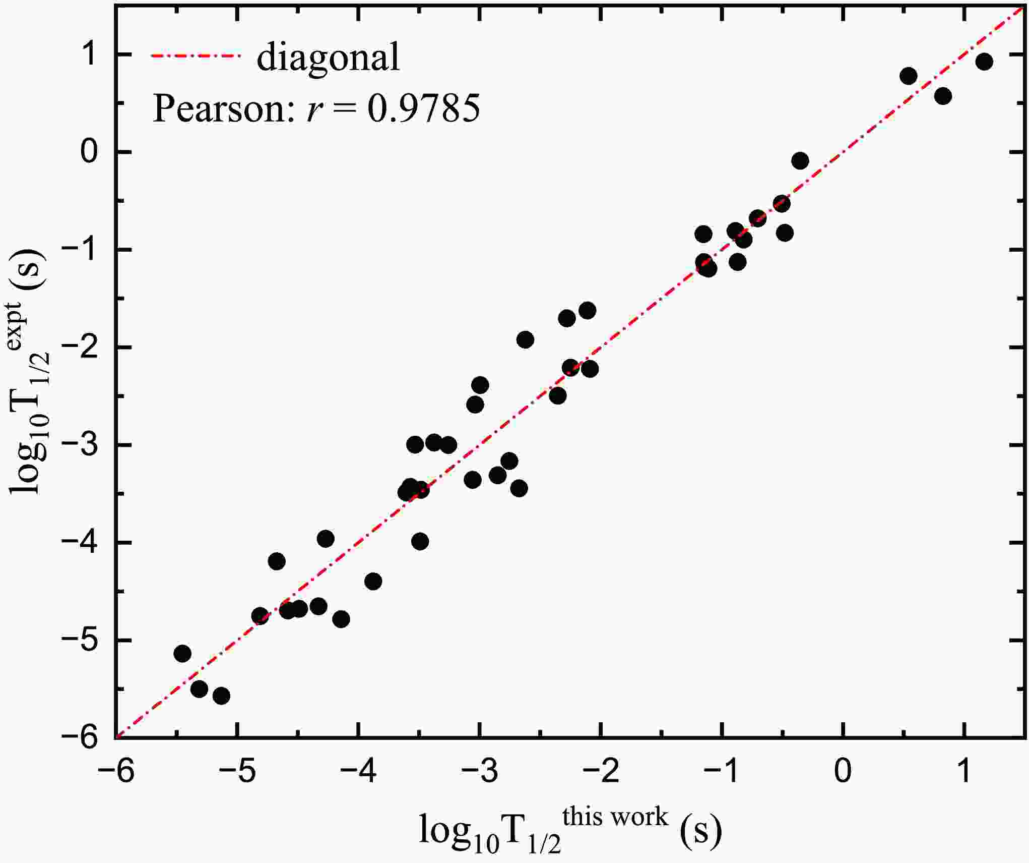 In Fig. 2, we plot the experimental one-proton radioactive half-lives and the calculated ones within the present improved GN law. It can be seen that all the data points cluster closely around the red diagonal line. By calculating the Pearson correlation coefficient with