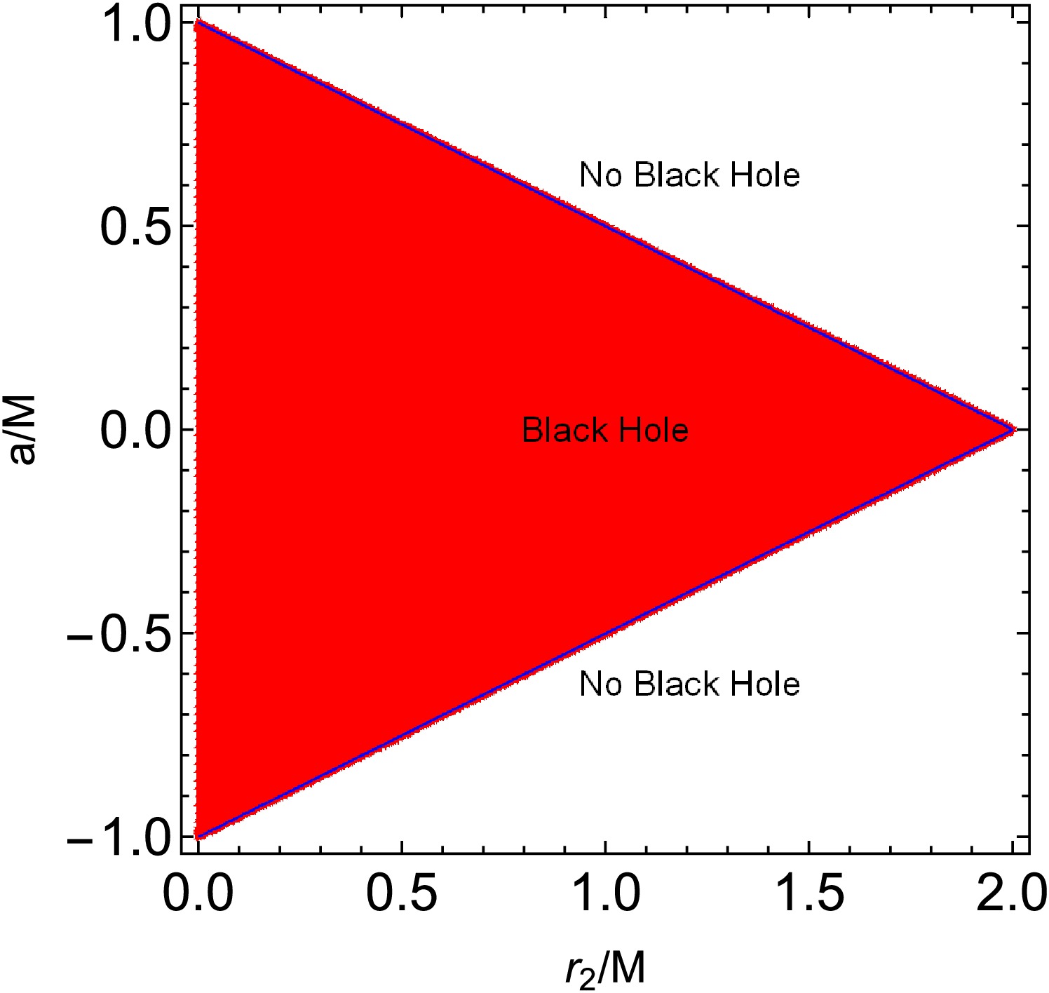 $ r_2 $ , while the vertical axis denotes the BH spin a. The red region corresponds to the parameter space where two distinct event horizons exist, whereas the white region indicates the domain in which naked singularity appears. -