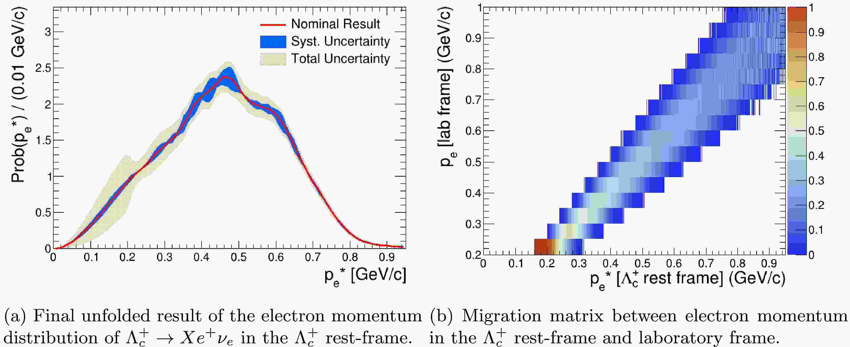 $ f_{predict} (p_e) $ , and a migration matrix$ {\cal{M}} $ , which maps the relationship between the generated electron momentum in$ \Lambda_c^+ $ rest-frame and observed electron momentum in lab-frame. -