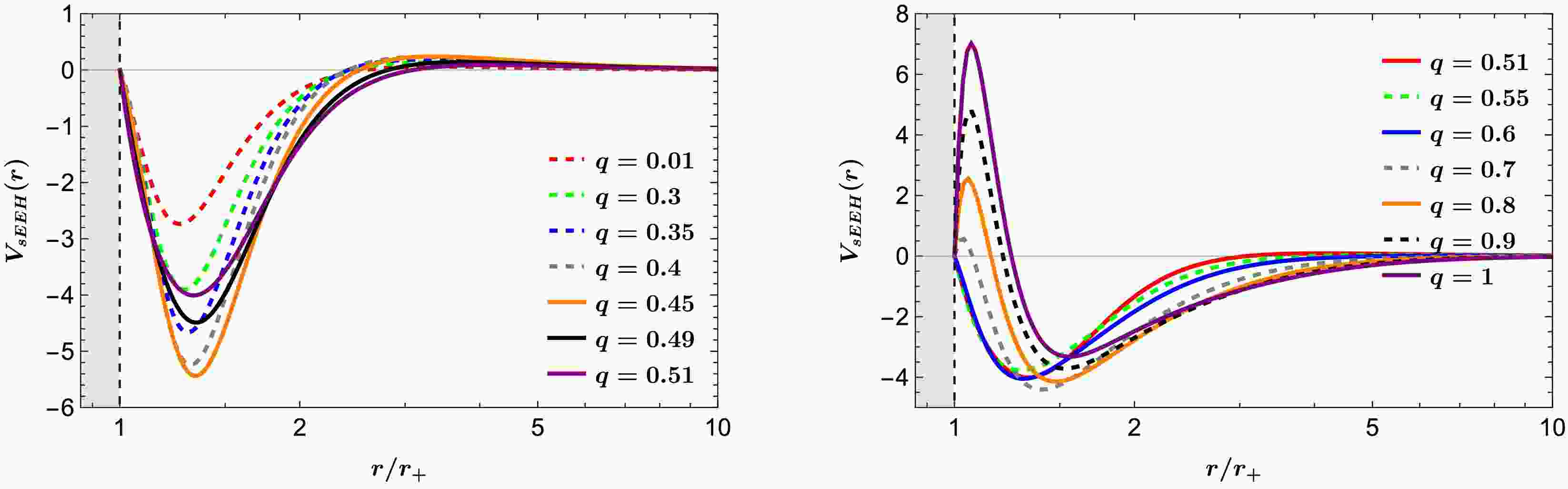 $ V_{\rm{sEEH}}(r,q) $ . Fig. 8 displays scalar potential$ V_{\rm{sEEH}}(r,q) $ for$ l=0(s $ -mode) scalar with$ q>0 $ in the single branch. In the left panel, one observes that$ V_{\rm{sEEH}}(r,q) $ develops negative regions near the event horizon for$ q \leq 0.51 $ . In contrast, the right panel shows that for$ q>0.5 $ a potential barrier forms, followed by the emergence of a potential well in the intermediate radial region. However, the mere presence of a potential well does not, by itself, imply that the single branch with$ q>0 $ is unstable under radial perturbations.