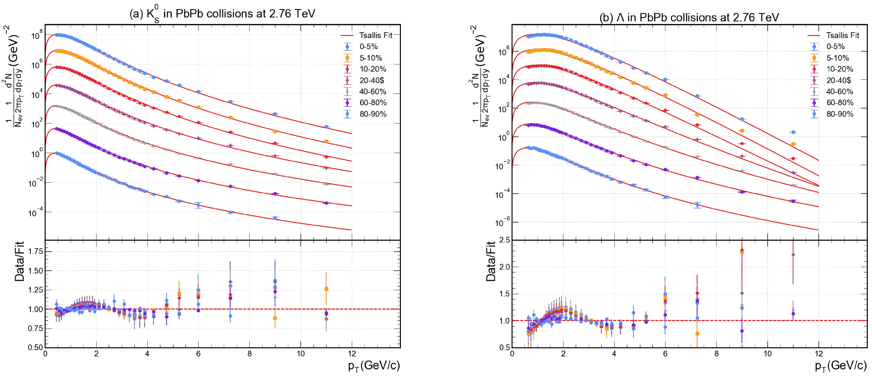 $ p_T $ distribution of$ K_s^0 $ and Λ measured by ALICE collaboration at 2.76 TeV of Pb–Pb collisions in different centrality classes. Experimental data for various centrality values are shown with different coloured data points, while the solid lines represent the fitting result obtained through Eq. (2). Each graph has been provided with a Data/Fit panel attached to the lower part.The experimental data points are depicted with distinct symbols/colors for each centrality bin, while the solid lines represent the fitted Tsallis function. Each panel includes a data/fit ratio inset, which confirms that the deviations of the fit from the data are minimal and randomly distributed around unity, indicating a high-quality fit. The