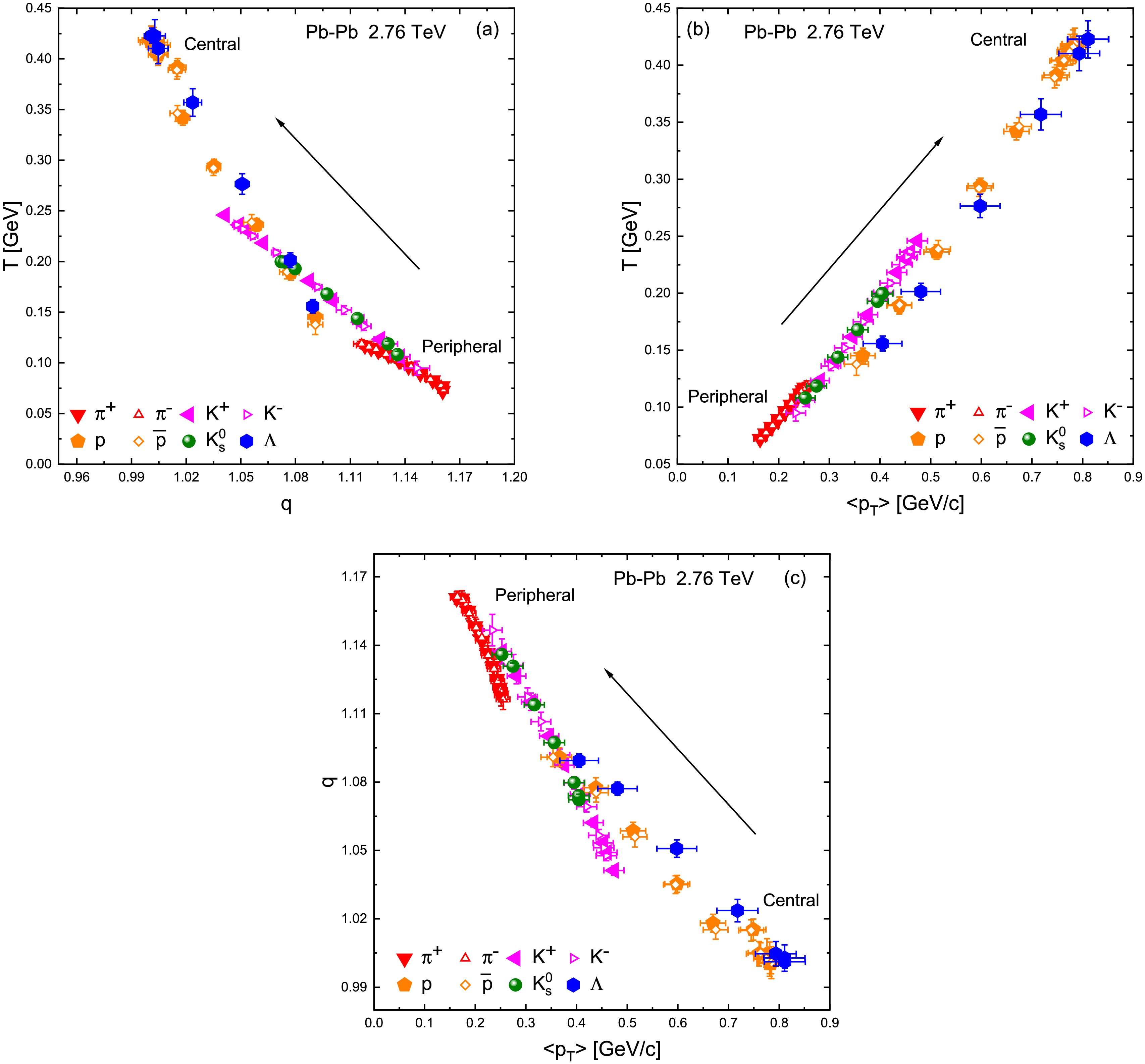 $ \langle p_T\rangle $ and (c) q and$ \langle p_T\rangle $ .Figure 4b reveals a tight direct correlation between T and
