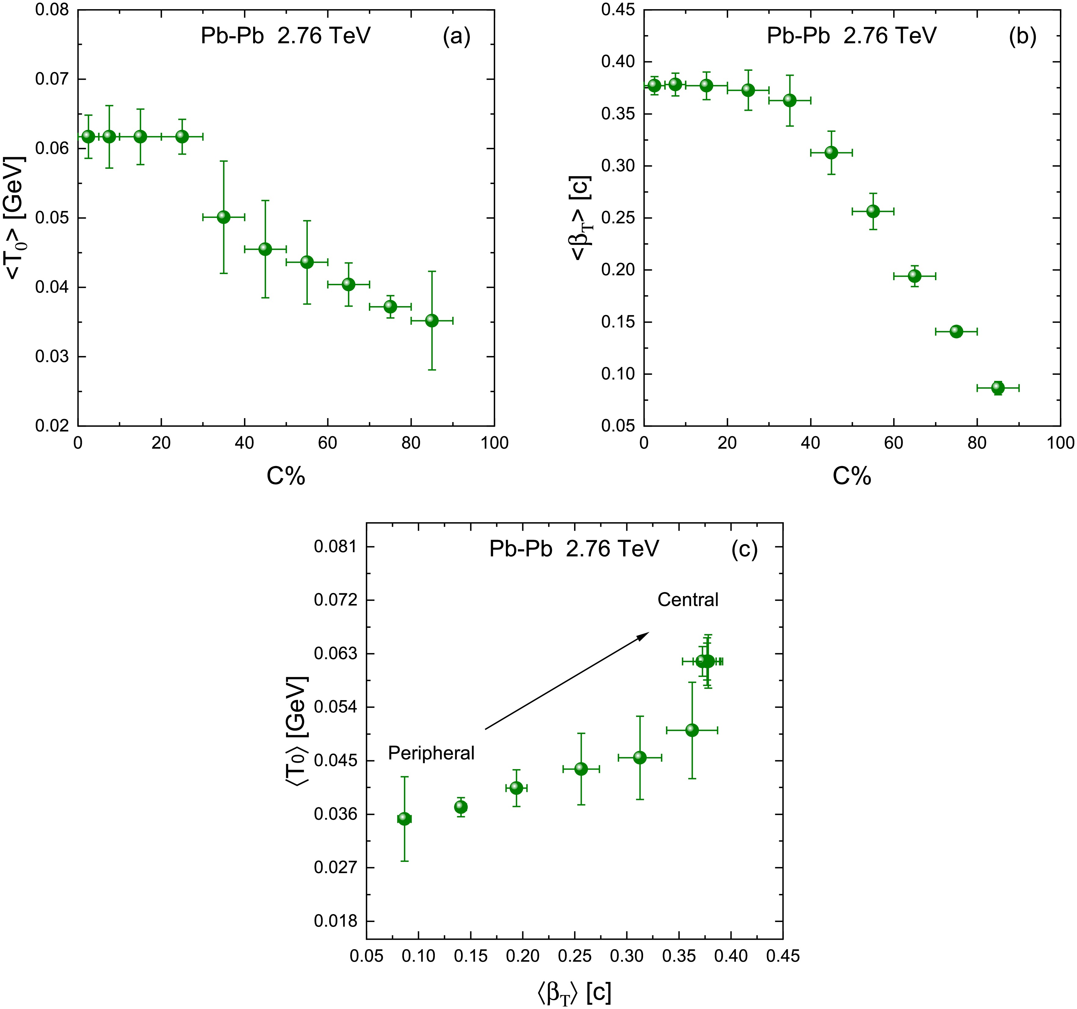 $ T_0 $ and$ \langle \beta_T \rangle $ for each centrality class via the above procedure the numerical values are compiled in Tables 2 and 3, we now examine how these freeze-out parameters vary with centrality. Figure 6a shows the centrality dependence of$ \langle T_0 \rangle $ , the average kinetic freeze-out temperature. We find that$ \langle T_0 \rangle $ increases from peripheral collisions up to mid-central collisions, and then saturates or plateaus for the most central collisions. Specifically, going from the most peripheral bin e.g. 80–90% peripheral into central bins,$ \langle T_0 \rangle $ rises sharply, reaching a maximum around the 20–30% centrality class. For centralities finer than about 20–30% toward 0% central, i.e. head-on collisions,$ \langle T_0 \rangle $ no longer grows and instead flattens out. In our data, this saturation value of$ \langle T_0 \rangle $ is on the order of$ \sim100 $ –110 MeV exact values in Table 2, after having risen from a peripheral value around 80–90 MeV. The initial rise of$ \langle T_0 \rangle $ with centrality can be understood as follows: more central collisions deposit greater energy density, which initially leads to a hotter kinetic freeze-out temperature (the system can cool to a lower temperature only in the very central collisions after substantial expansion). However, the observed saturation at mid-central to central events is a striking feature. One possible interpretation is that once the collisions become energetic enough beyond a threshold centrality, any additional energy pumped into the system goes into driving a phase transition or into expansion work rather than raising the kinetic freeze-out temperature. In other words, the system may be hitting the limit of hadronic temperature, beyond which extra energy is absorbed as latent heat for parton-hadron phase transition. The centrality interval of 20–30% appears to correspond to the point where this change occurs in our analysis. It is tempting to associate this behavior with the onset of deconfinement or a softest-point effect in the equation of state. As the collision becomes more central, the fireball spends more time in a mixed phase QGP + hadrons or undergoes a soft phase transition such that the temperature ceases to increase despite higher input energy. While our experiment is at a fixed collision energy 2.76 TeV, a similar saturation of kinetic freeze-out$ T_0 $ across centrality was also hinted at in intermediate-energy collisions in Ref. [35], which the authors interpreted as a signature of approaching the QGP phase transition. Our observation here at the LHC suggests that even at the highest energies, central collisions might achieve a state where the kinetic freeze-out temperature is limited by phase transition dynamics. Any further increase in centrality simply results in more latent heat rather than exciting the system.